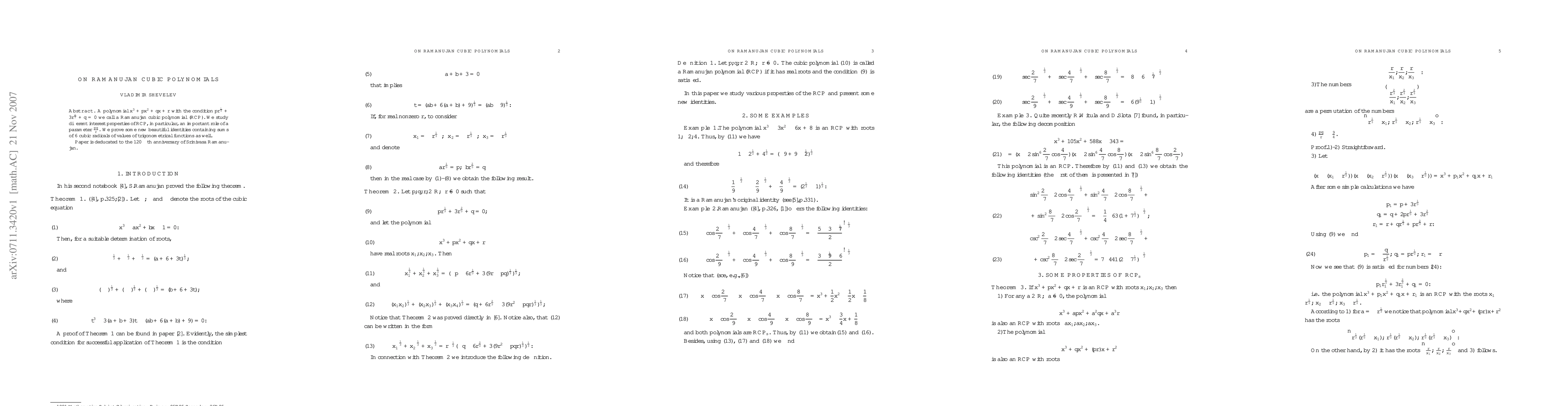 This research paper investigates Ramanujan cubic polynomials, exploring properties and identities related to a key parameter pq/r. It reveals beautiful mathematical connections involving sums of 6 cubic radicals of trigonometric function values.