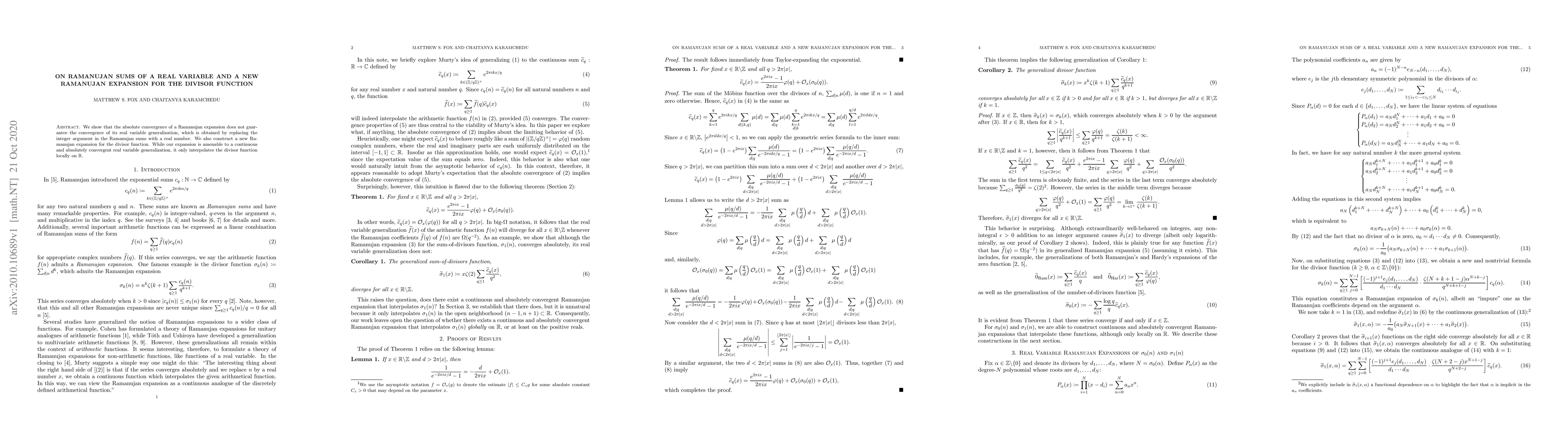 We show that the absolute convergence of a Ramanujan expansion does not guarantee the convergence of its real variable generalization, which is obtained by replacing the integer argument in the Ramanujan sums with a real number. We also construct a new Ramanujan expansion for the divisor function. While our expansion is amenable to a continuous and absolutely convergent real variable generalization, it only interpolates the divisor function locally on $\mathbb{R}$.