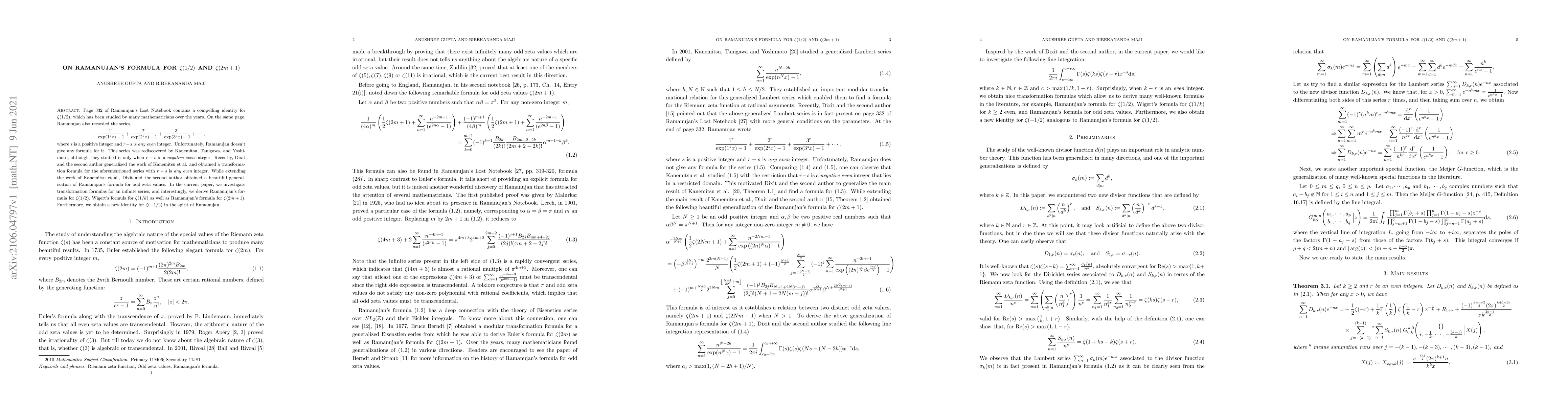 This paper investigates transformation formulas for infinite series, deriving Ramanujan's formula for $\zeta(1/2)$, Wigert's formula for $\zeta(1/k)$, and Ramanujan's formula for $\zeta(2m+1)$. Additionally, a novel identity for $\zeta(-1/2)$ is presented.