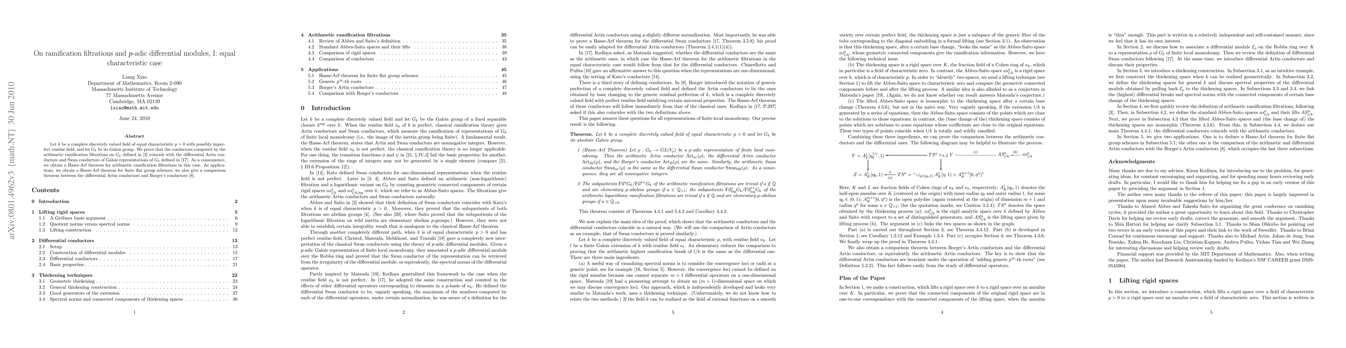 This paper proves that the conductors from arithmetic ramification filtrations on the Galois group $G_k$ of a complete field $k$ of equal characteristic $p$ match the differential Artin conductors and Swan conductors for Galois representations. It also establishes a Hasse-Arf theorem for these filtrations and provides applications including a Hasse-Arf theorem for finite flat group schemes and a comparison theorem between differential Artin conductors and Borger's conductors.