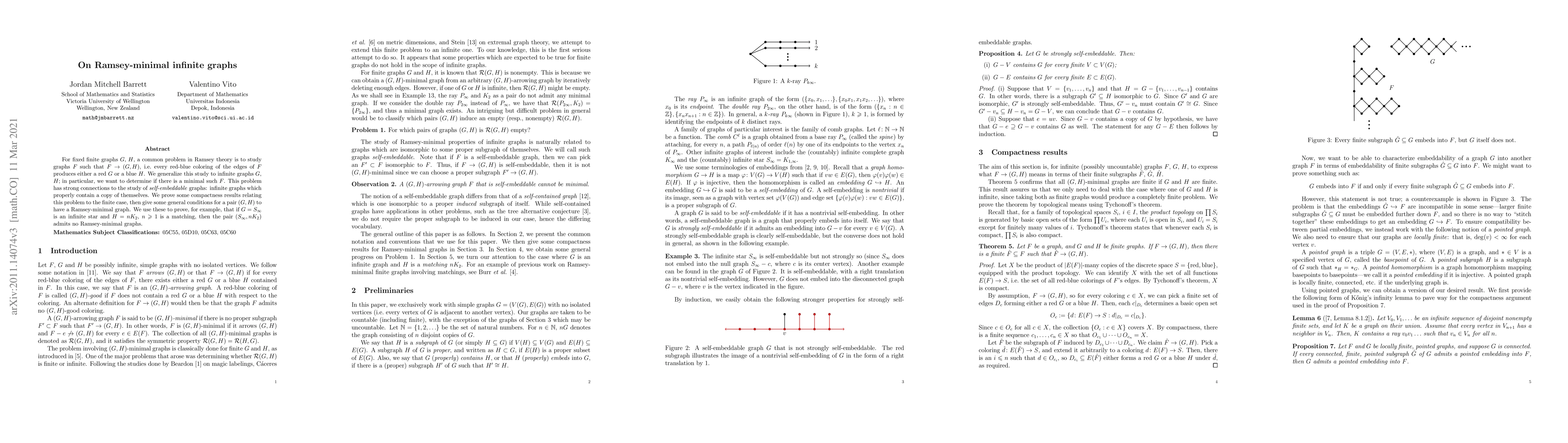 This paper studies infinite graphs that guarantee the presence of a finite subgraph $G$ or $H$ under any edge coloring, generalizing Ramsey theory to the infinite setting. The authors prove compactness results and provide conditions for the existence of Ramsey-minimal graphs, showing that certain pairs like $(S_\infty, nK_2)$ lack such graphs.