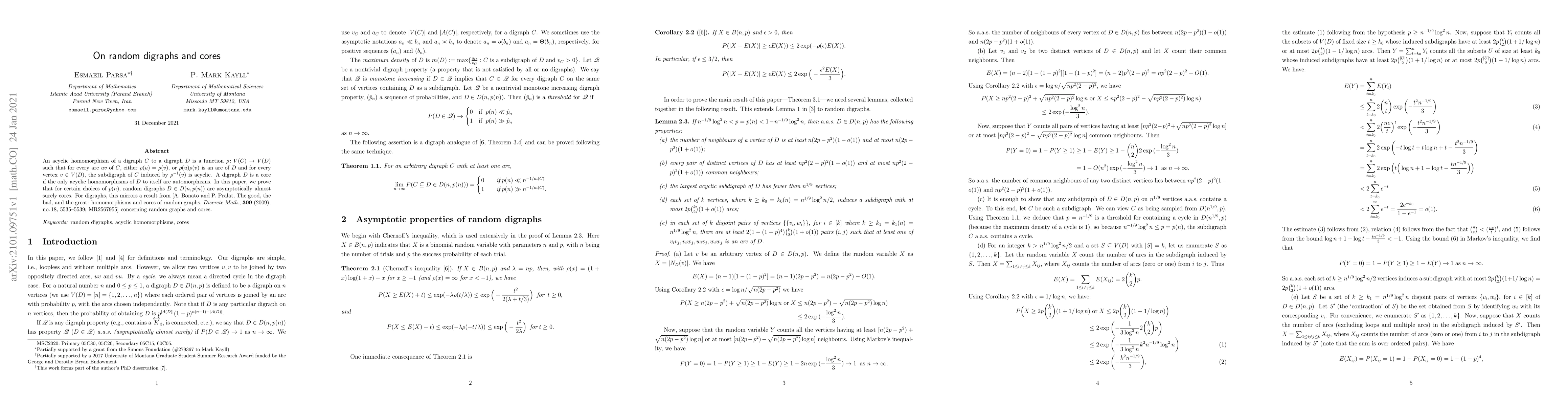This paper investigates the properties of random digraphs under specific probability conditions, proving that they are asymptotically almost surely cores. This result parallels findings in random graphs, where similar structures exhibit core properties.