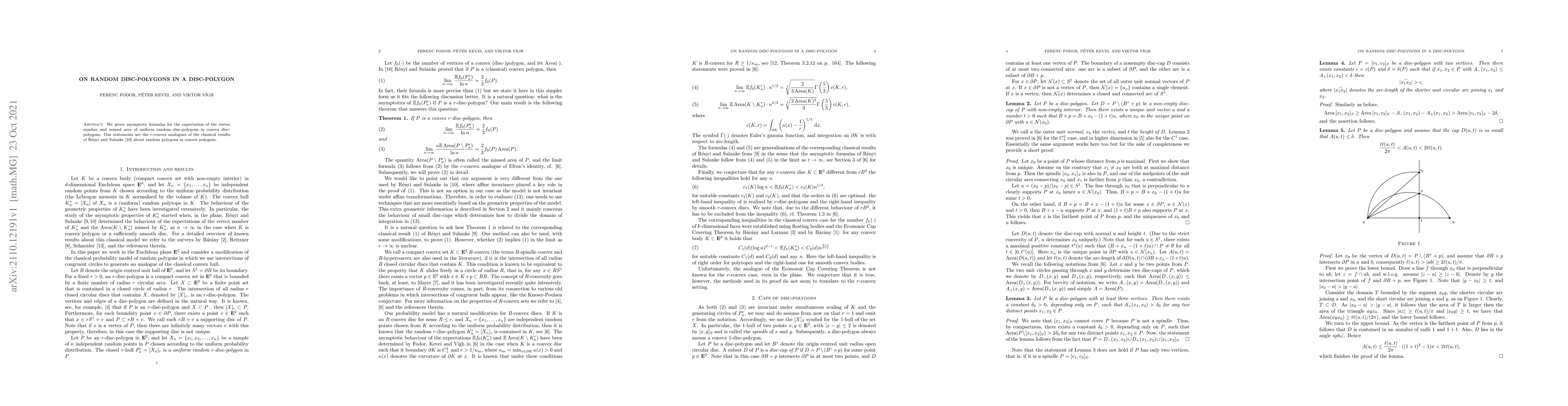 This paper proves asymptotic formulas for the expectation of vertex number and missed area of random disc-polygons in convex disc-polygons, building on earlier work by Rényi and Sulanke.