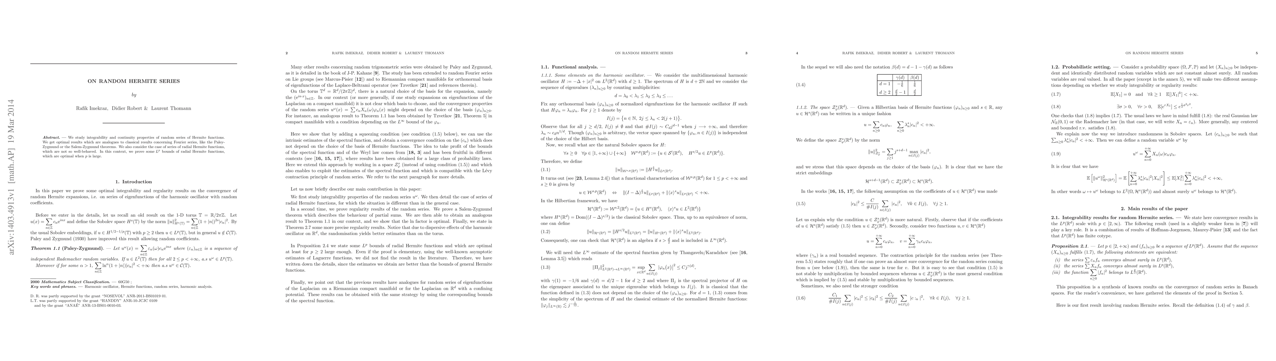 This paper investigates the integrability and continuity properties of random series composed of Hermite functions, achieving optimal results analogous to classical Fourier series theorems. It also explores the less well-understood radial Hermite functions, proving optimal L^p bounds for large p.