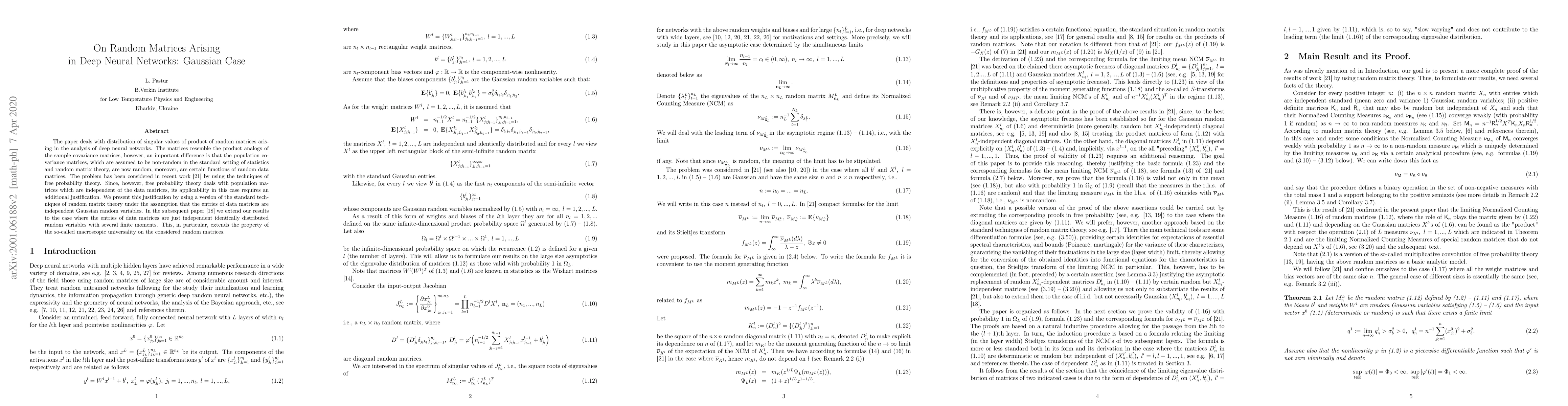 The paper deals with distribution of singular values of product of random matrices arising in the analysis of deep neural networks. The matrices resemble the product analogs of the sample covariance matrices, however, an important difference is that the population covariance matrices, which are assumed to be non-random in the standard setting of statistics and random matrix theory, are now random, moreover, are certain functions of random data matrices. The problem has been considered in recent work [21] by using the techniques of free probability theory. Since, however, free probability theory deals with population matrices which are independent of the data matrices, its applicability in this case requires an additional justification. We present this justification by using a version of the standard techniques of random matrix theory under the assumption that the entries of data matrices are independent Gaussian random variables. In the subsequent paper [18] we extend our results to the case where the entries of data matrices are just independent identically distributed random variables with several finite moments. This, in particular, extends the property of the so-called macroscopic universality on the considered random matrices.
