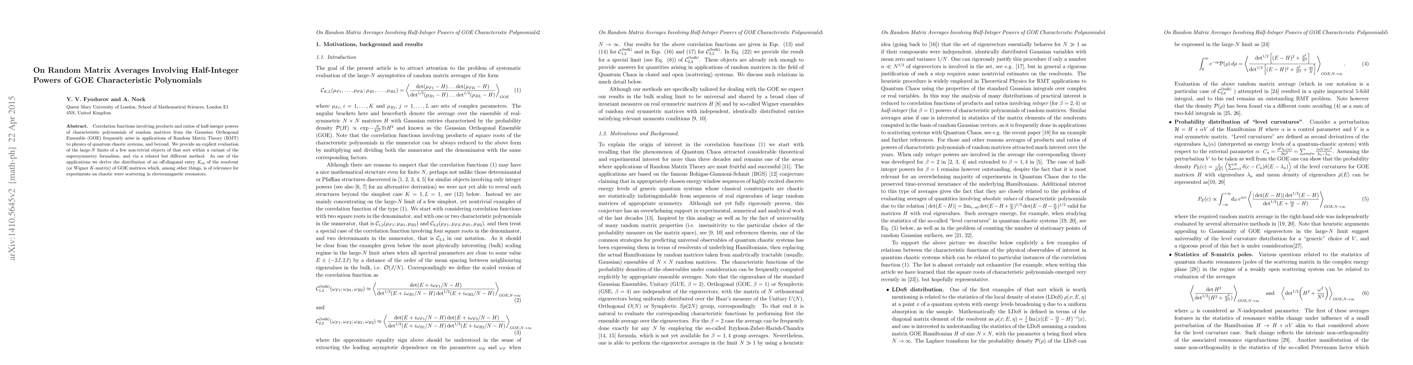 Correlation functions involving products and ratios of half-integer powers of characteristic polynomials of random matrices from the Gaussian Orthogonal Ensemble (GOE) frequently arise in applications of Random Matrix Theory (RMT) to physics of quantum chaotic systems, and beyond. We provide an explicit evaluation of the large-$N$ limits of a few non-trivial objects of that sort within a variant of the supersymmetry formalism, and via a related but different method. As one of the applications we derive the distribution of an off-diagonal entry $K_{ab}$ of the resolvent (or Wigner $K$-matrix) of GOE matrices which, among other things, is of relevance for experiments on chaotic wave scattering in electromagnetic resonators.