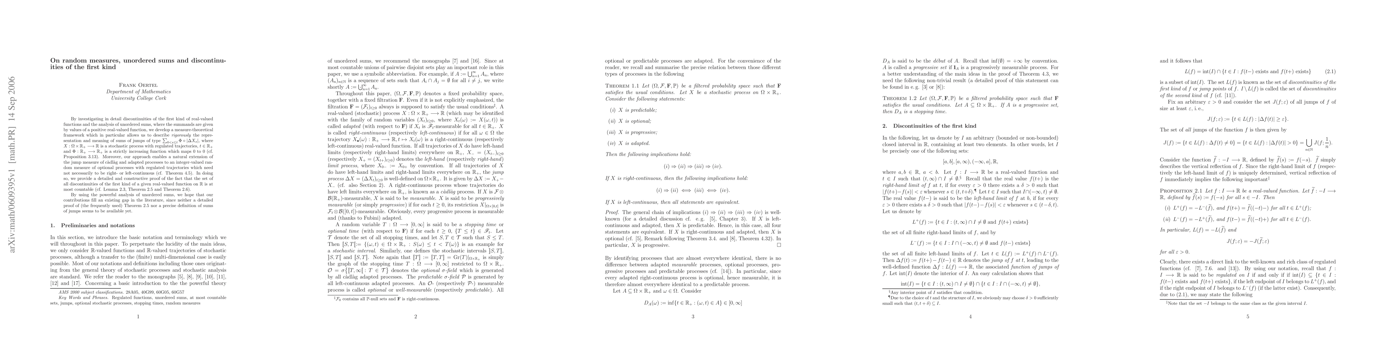 By investigating in detail discontinuities of the first kind of real-valued functions and the analysis of unordered sums, where the summands are given by values of a positive real-valued function, we develop a measure-theoretical framework which in particular allows us to describe \textit{rigorously} the representation and meaning of sums of jumps of type $\sum_{0 < s \leq t} \Phi \circ | \Delta X_s |$, where $X : \Omega \times \R_+ \longrightarrow \R$ is a stochastic process with regulated trajectories, $t \in \R_+$ and $\Phi : \R_+ \longrightarrow \R_+$ is a strictly increasing function which maps 0 to 0 (cf. Proposition \ref{prop:sum of jumps on R+ with invertible function}). Moreover, our approach enables a natural extension of the jump measure of c\`{a}dl\`{a}g and adapted processes to an integer-valued random measure of optional processes with regulated trajectories which need not necessarily to be right- or left-continuous (cf. Theorem \ref{thm:optional random measures}). In doing so, we provide a detailed and constructive proof of the fact that the set of all discontinuities of the first kind of a given real-valued function on $\R$ is at most countable (cf. Lemma \ref{lemma:right limits and left limits}, Theorem \ref{thm:at most countably many jumps on compact intervals} and Theorem \ref{thm:at most countably many jumps on R+}). By using the powerful analysis of unordered sums, we hope that our contributions fill an existing gap in the literature, since neither a detailed proof of (the frequently used) Theorem \ref{thm:at most countably many jumps on compact intervals} nor a precise definition of sums of jumps seems to be available yet.