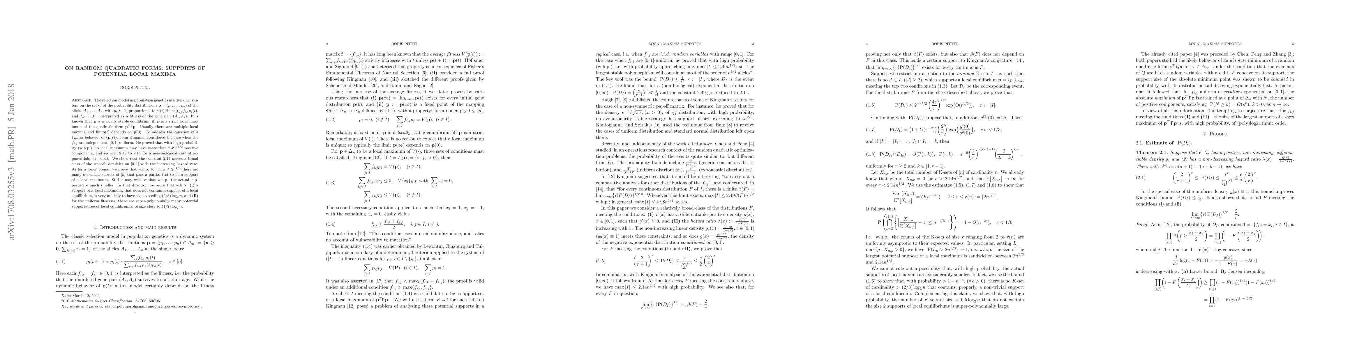 In the late eighties John Kingman studied the problem of maxima of a quadratic form, with independent, uniformly distributed, coefficients, on a simplex of growing dimension $n$. In particular, he proved that the largest support size (cardinality) $L_n$ of a potential local maximum is, in probability, $2.49 n^{1/2}$ at most, and for a non-biological case of independent exponentials on $[0,\infty)$ he reduced the constant to $2.14$. In this paper we show that the constant $2.14$ serves a broad class of the densities on $[0,1]$, which includes a linear non-decreasing (whence uniform) density and the exponential density conditioned on $[0,1]$. We also prove a qualitatively matching lower bound: in probability, $L_n\ge 2n^{1/3}$ at least. Our argument shows also that the random counts of potential maxima supports, whose sizes range from $2$ to $\lceil 2n^{1/3}\rceil$, are asymptotic to their expected values. Finally we show that a support of a local maximum, that does not contain a support of a local equilibrium, is very unlikely to have size exceeding $2\log_2 n$.