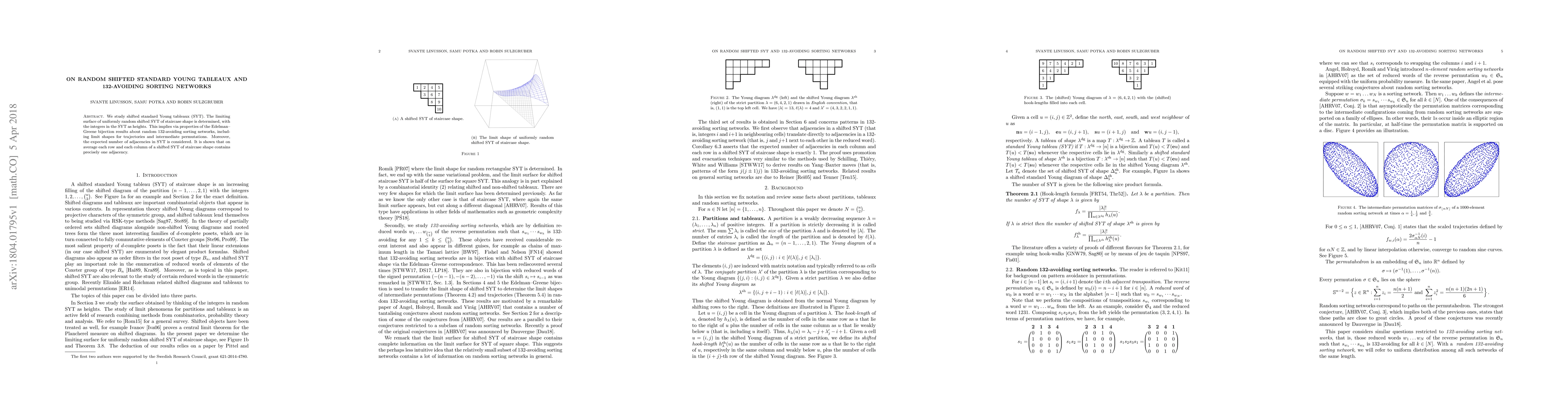 This paper examines shifted standard Young tableaux (SYT) and reveals the limiting surface of random shifted SYT of staircase shape. It links these findings to properties of 132-avoiding sorting networks, determining their limit shapes, and shows that each row and column in such SYT contains exactly one adjacency on average.