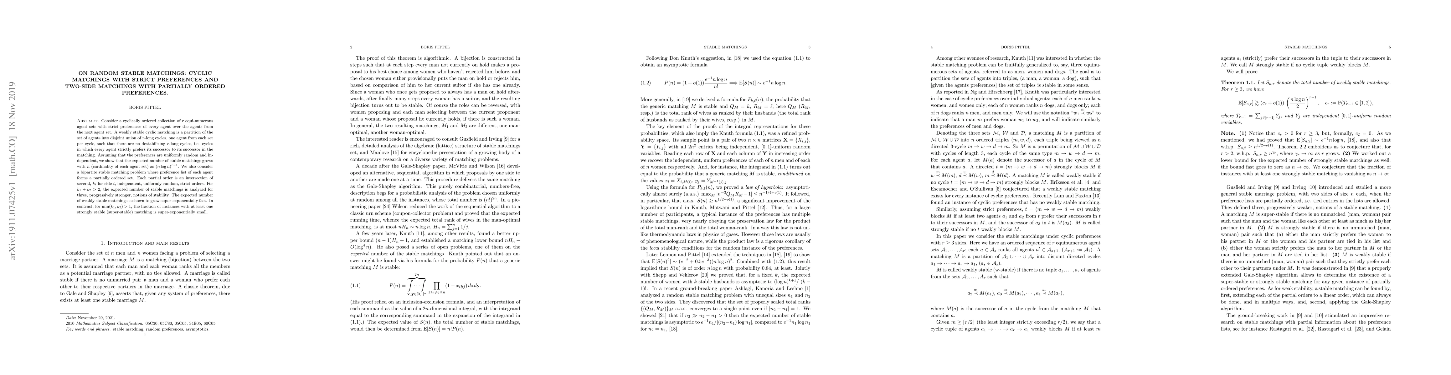 Consider a cyclically ordered collection of $r$ equinumerous agent sets with strict preferences of every agent over the agents from the next agent set. A weakly stable cyclic matching is a partition of the set of agents into disjoint union of $r$-long cycles, one agent from each set per cycle, such that there are no destabilizing $r$-long cycles, i.e. cycles in which every agent strictly prefers its successor to its successor in the matching. Assuming that the preferences are uniformly random and independent, we show that the expected number of stable matchings grows with $n$ (cardinality of each agent set) as $(n\log n)^{r-1}$. We also consider a bipartite stable matching problem where preference list of each agent forms a partially ordered set. Each partial order is an intersection of several, $k_i$ for side $i$, independent, uniformly random, strict orders. For $k_1+k_2>2$, the expected number of stable matchings is analyzed for three, progressively stronger, notions of stability. The expected number of weakly stable matchings is shown to grow super-exponentially fast. In contrast, for $\min(k_1,k_2)>1$, the fraction of instances with at least one strongly stable (super-stable) matching is super-exponentially small.