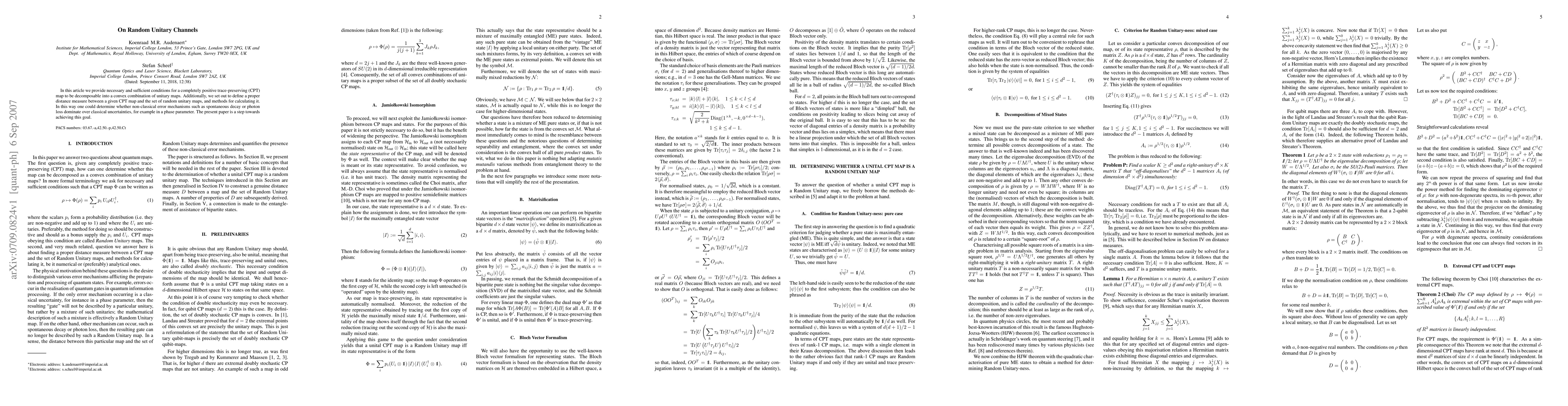 In this article we provide necessary and sufficient conditions for a completely positive trace-preserving (CPT) map to be decomposable into a convex combination of unitary maps. Additionally, we set out to define a proper distance measure between a given CPT map and the set of random unitary maps, and methods for calculating it. In this way one could determine whether non-classical error mechanisms such as spontaneous decay or photon loss dominate over classical uncertainties, for example in a phase parameter. The present paper is a step towards achieving this goal.