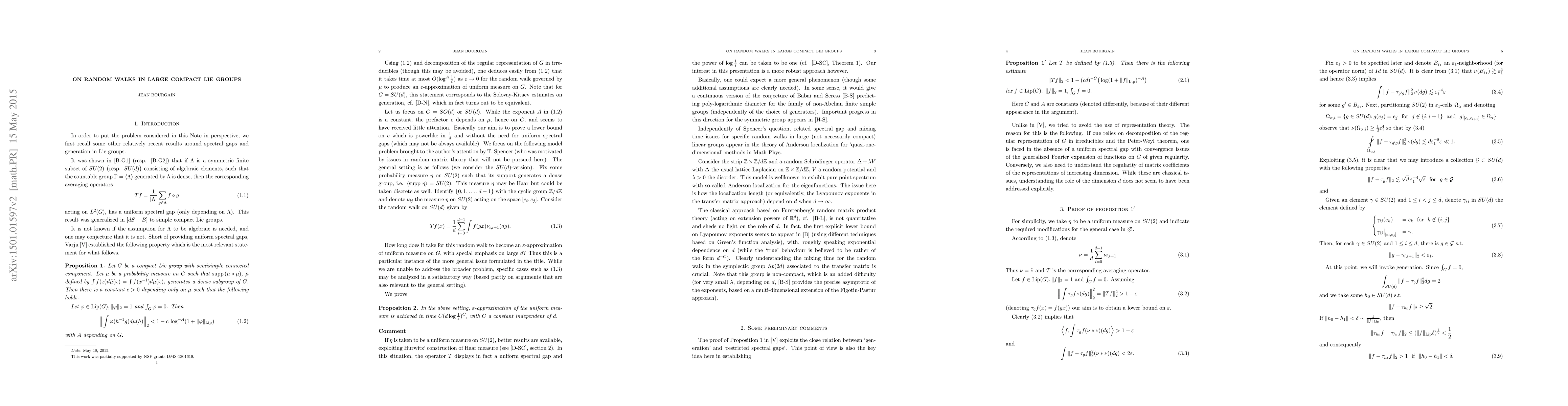 The paper presents Propositions 1' and 2, offering novel estimates for random walk operators on large compact Lie groups, particularly unitary groups, and demonstrates rapid convergence under specific conditions.