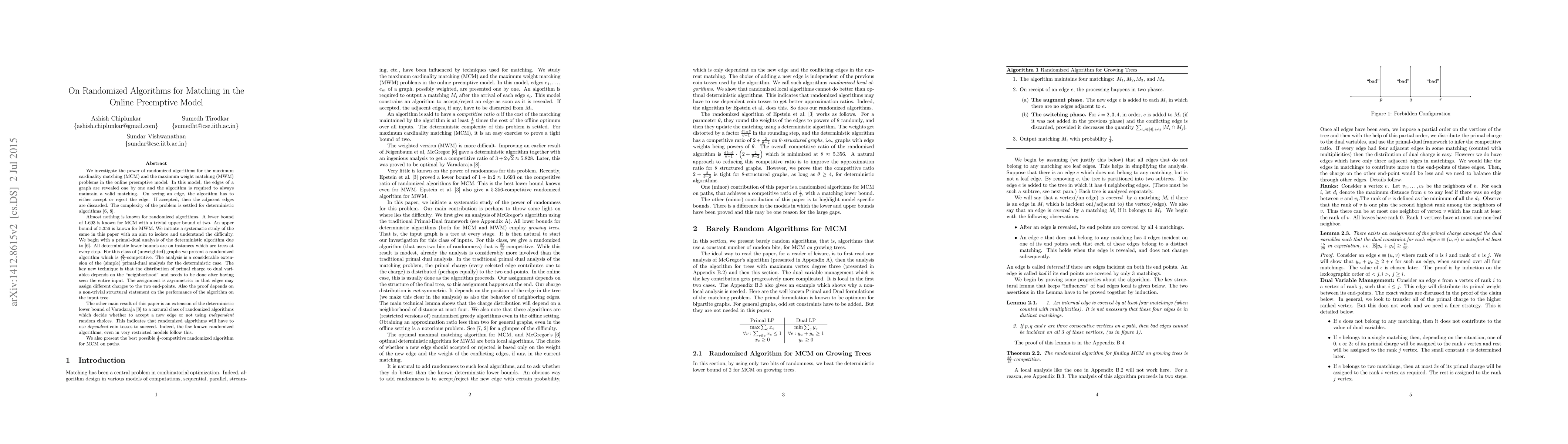 We investigate the power of randomized algorithms for the maximum cardinality matching (MCM) and the maximum weight matching (MWM) problems in the online preemptive model. In this model, the edges of a graph are revealed one by one and the algorithm is required to always maintain a valid matching. On seeing an edge, the algorithm has to either accept or reject the edge. If accepted, then the adjacent edges are discarded. The complexity of the problem is settled for deterministic algorithms. Almost nothing is known for randomized algorithms. A lower bound of $1.693$ is known for MCM with a trivial upper bound of $2$. An upper bound of $5.356$ is known for MWM. We initiate a systematic study of the same in this paper with an aim to isolate and understand the difficulty. We begin with a primal-dual analysis of the deterministic algorithm due to McGregor. All deterministic lower bounds are on instances which are trees at every step. For this class of (unweighted) graphs we present a randomized algorithm which is $\frac{28}{15}$-competitive. The analysis is a considerable extension of the (simple) primal-dual analysis for the deterministic case. The key new technique is that the distribution of primal charge to dual variables depends on the "neighborhood" and needs to be done after having seen the entire input. The assignment is asymmetric: in that edges may assign different charges to the two end-points. Also the proof depends on a non-trivial structural statement on the performance of the algorithm on the input tree. The other main result of this paper is an extension of the deterministic lower bound of Varadaraja to a natural class of randomized algorithms which decide whether to accept a new edge or not using independent random choices.