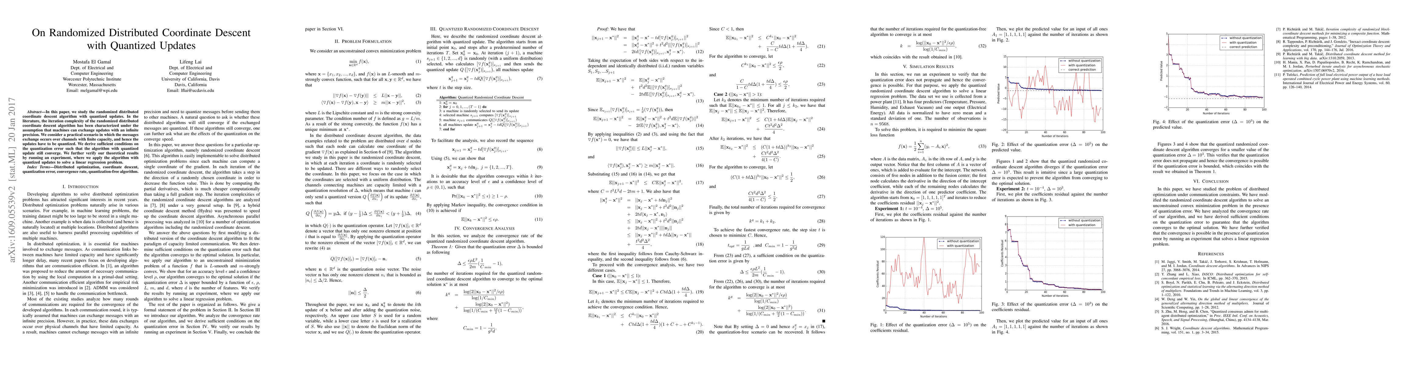 This paper investigates the randomized distributed coordinate descent algorithm with quantized updates, deriving conditions under which convergence is maintained despite finite precision communication. Experimental validation on a linear regression problem confirms the theoretical findings.