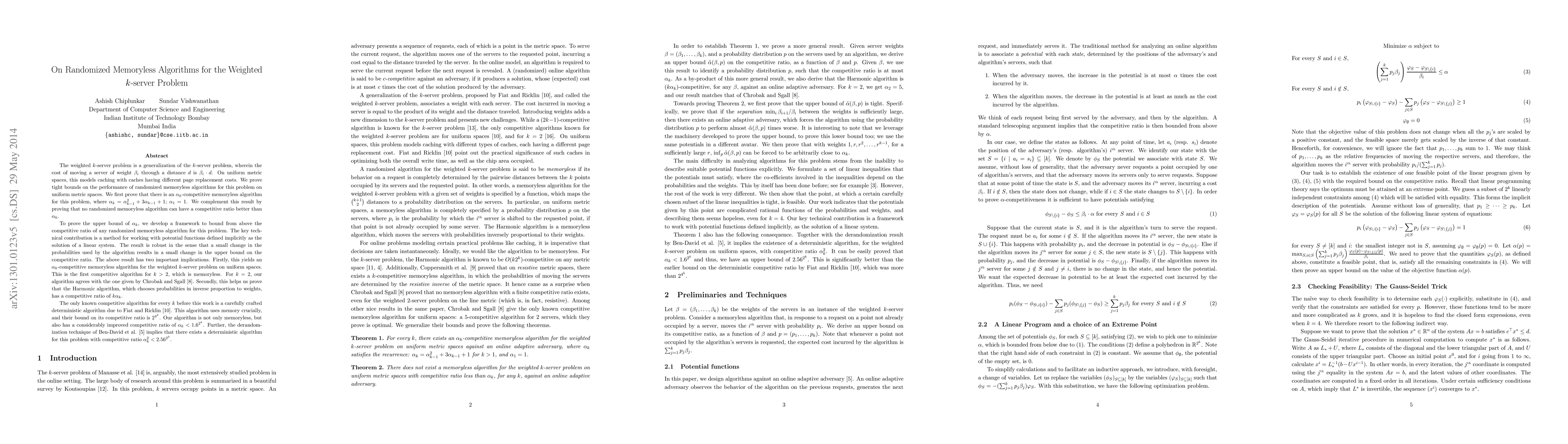The weighted $k$-server problem is a generalization of the $k$-server problem in which the cost of moving a server of weight $\beta_i$ through a distance $d$ is $\beta_i\cdot d$. The weighted server problem on uniform spaces models caching where caches have different write costs. We prove tight bounds on the performance of randomized memoryless algorithms for this problem on uniform metric spaces. We prove that there is an $\alpha_k$-competitive memoryless algorithm for this problem, where $\alpha_k=\alpha_{k-1}^2+3\alpha_{k-1}+1$; $\alpha_1=1$. On the other hand we also prove that no randomized memoryless algorithm can have competitive ratio better than $\alpha_k$. To prove the upper bound of $\alpha_k$ we develop a framework to bound from above the competitive ratio of any randomized memoryless algorithm for this problem. The key technical contribution is a method for working with potential functions defined implicitly as the solution of a linear system. The result is robust in the sense that a small change in the probabilities used by the algorithm results in a small change in the upper bound on the competitive ratio. The above result has two important implications. Firstly this yields an $\alpha_k$-competitive memoryless algorithm for the weighted $k$-server problem on uniform spaces. This is the first competitive algorithm for $k>2$ which is memoryless. Secondly, this helps us prove that the Harmonic algorithm, which chooses probabilities in inverse proportion to weights, has a competitive ratio of $k\alpha_k$.