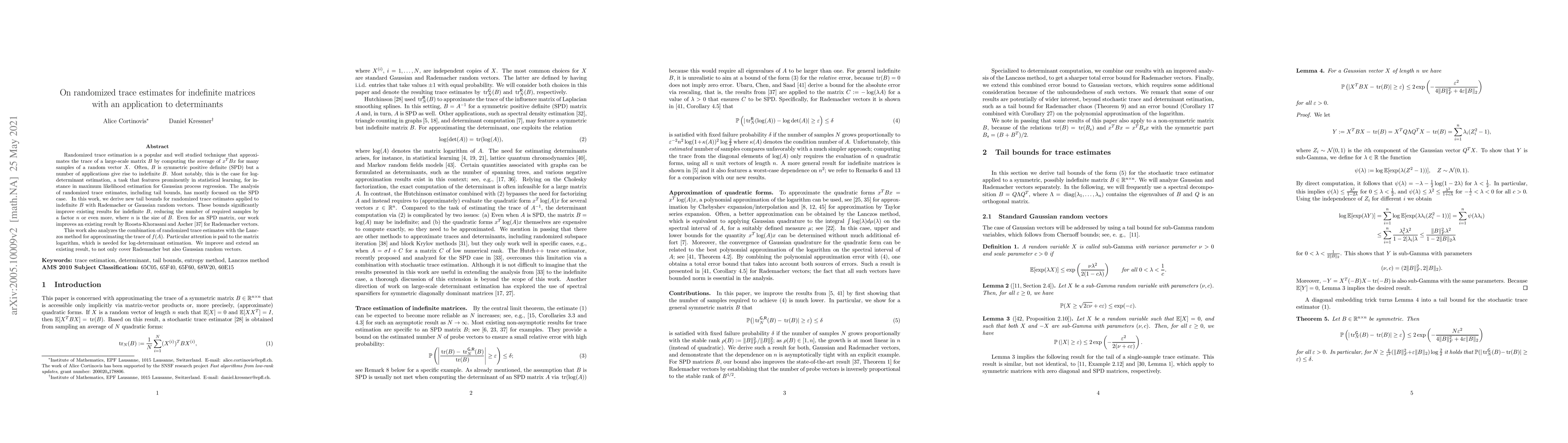 This paper develops new tail bounds for randomized trace estimates applied to indefinite matrices, significantly improving existing results by reducing the number of required samples. It also extends the analysis to the Lanczos method for approximating matrix functions, particularly focusing on the matrix logarithm for log-determinant estimation, improving results for both Rademacher and Gaussian random vectors.