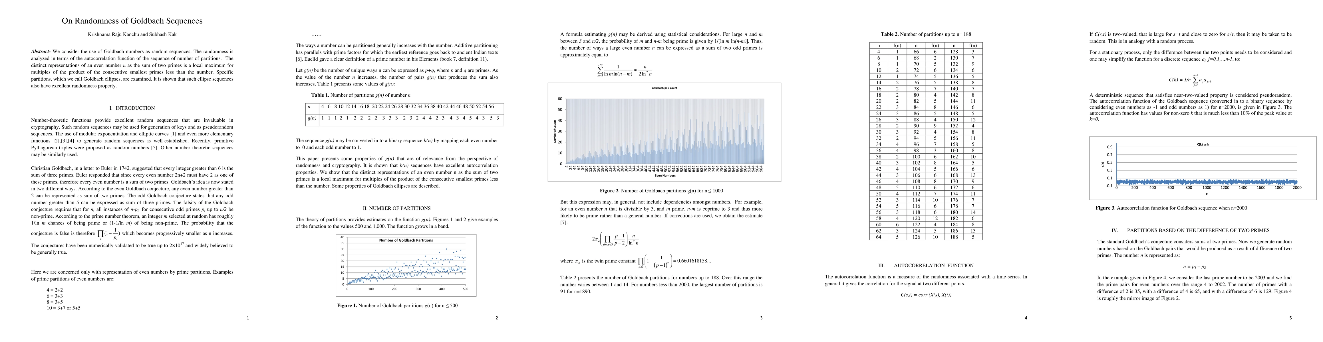 We consider the use of Goldbach numbers as random sequences. The randomness is analyzed in terms of the autocorrelation function of the sequence of number of partitions. The distinct representations of an even number n as the sum of two primes is a local maximum for multiples of the product of the consecutive smallest primes less than the number. Specific partitions, which we call Goldbach ellipses, are examined. It is shown that such ellipse sequences also have excellent randomness property.