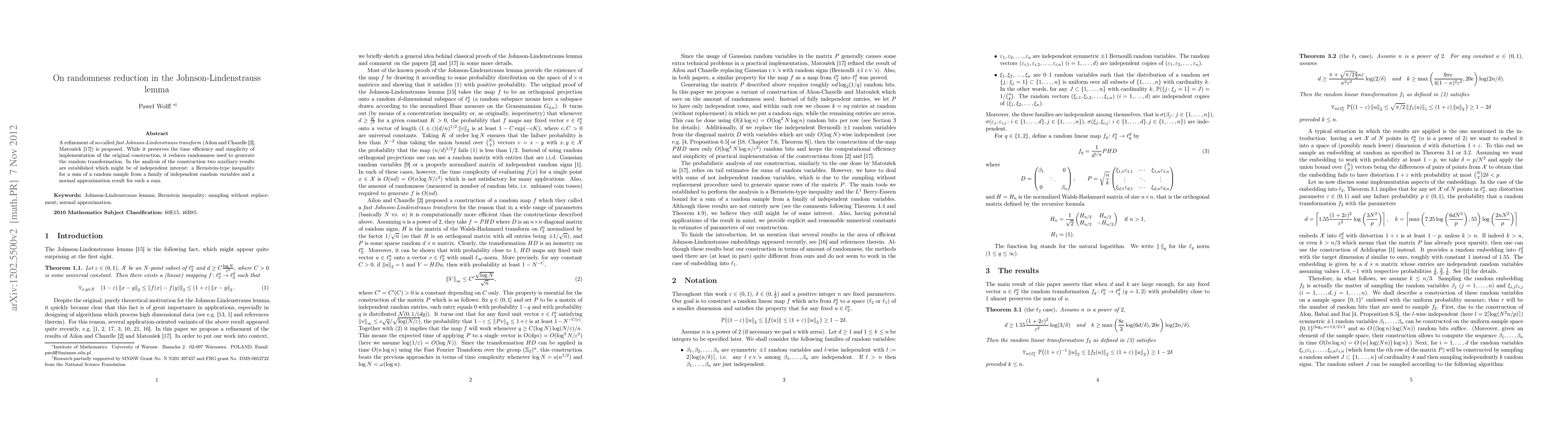 This paper proposes a refined version of the fast Johnson-Lindenstrauss transform that maintains time efficiency and simplicity while reducing the randomness required. It also establishes a Bernstein-type inequality and a normal approximation result for sums of random samples from independent random variables.