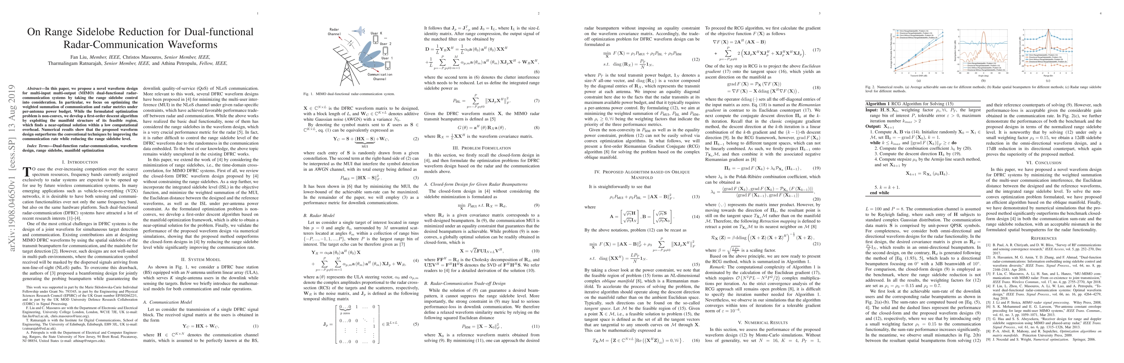 This paper proposes a novel waveform design for MIMO dual-functional radar-communication systems, focusing on range sidelobe reduction. It employs a first-order descent algorithm to optimize communication and radar metrics under power constraints, achieving better performance than conventional methods.