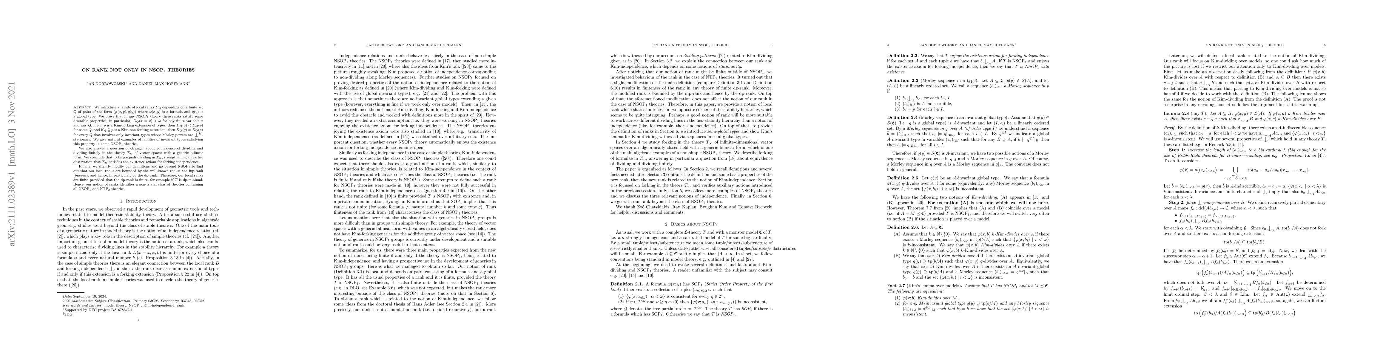 This paper introduces a family of local ranks DQ in NSOP1 theories, proving they satisfy desirable properties such as boundedness and monotonicity under forking extensions. It also answers a question about equivalence in the theory of vector spaces with a generic bilinear form, showing forking equals dividing, and extends the notion of ranks beyond NSOP1 to include dp-minimal theories.