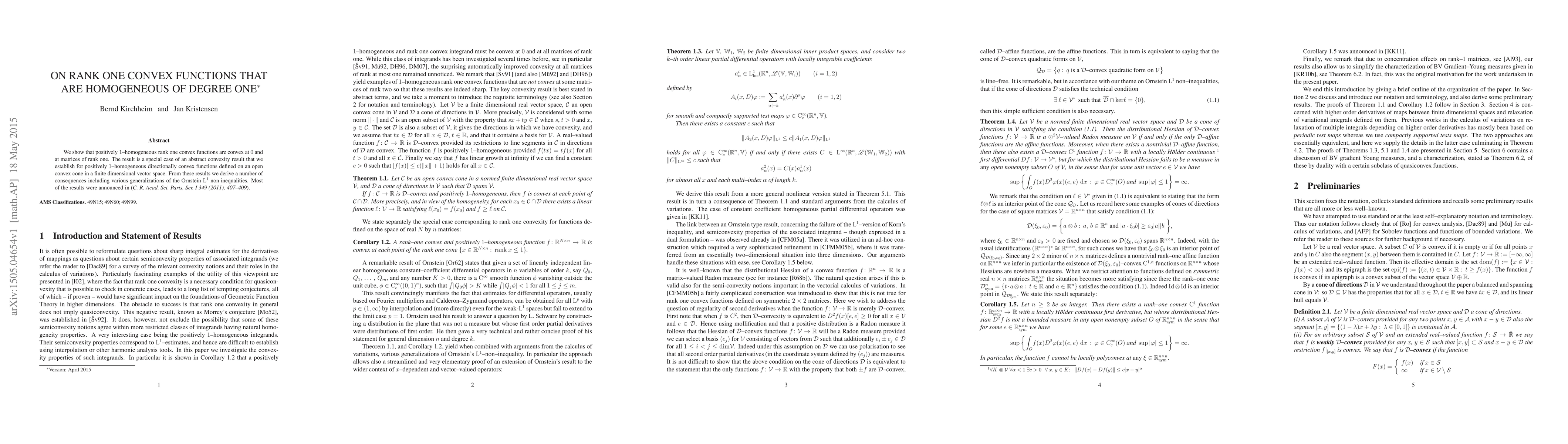 We show that positively $1$--homogeneous rank one convex functions are convex at $0$ and at matrices of rank one. The result is a special case of an abstract convexity result that we establish for positively $1$--homogeneous directionally convex functions defined on an open convex cone in a finite dimensional vector space. From these results we derive a number of consequences including various generalizations of the Ornstein $\LL^1$ non inequalities. Most of the results were announced in ({\em C.~R.~Acad.~Sci.~Paris, Ser.~I 349 (2011), 407--409}).