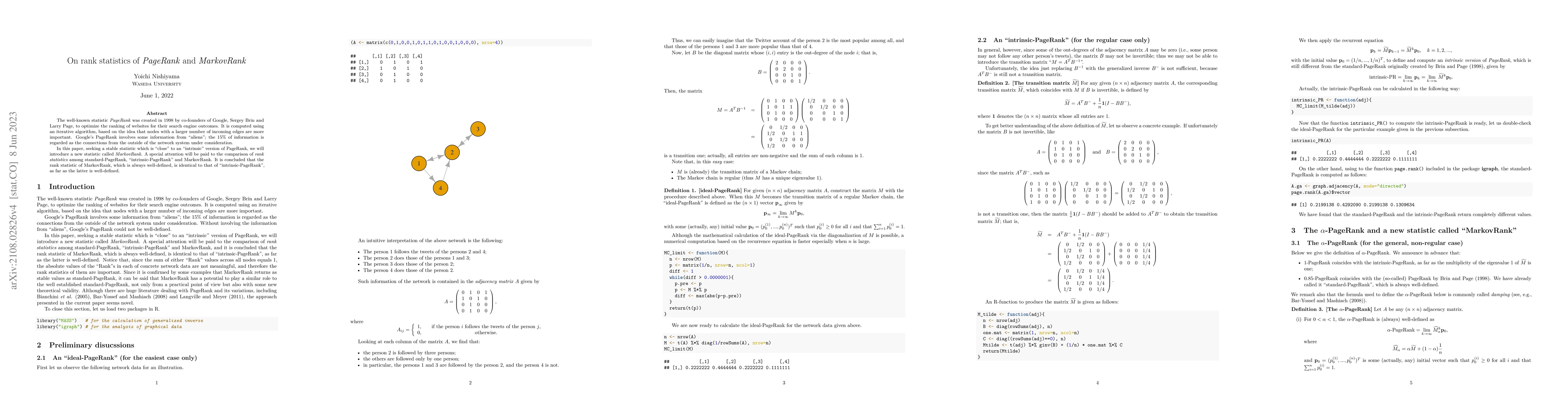 The well-known statistic PageRank was created in 1998 by co-founders of Google, Sergey Brin and Larry Page, to optimize the ranking of websites for their search engine outcomes. It is computed using an iterative algorithm, based on the idea that nodes with a larger number of incoming edges are more important. Google's PageRank involves some information from ``aliens''; the 15% of information is regarded as the connections from the outside of the network system under consideration. In this paper, seeking a stable statistic which is ``close'' to an ``intrinsic'' version of PageRank, we will introduce a new statistic called MarkovRank. A special attention will be paid to the comparison of rank statistics among standard-PageRank,``intrinsic-PageRank'' and MarkovRank. It is concluded that the rank statistic of MarkovRank, which is always well-defined, is identical to that of ``intrinsic-PageRank'', as far as the latter is well-defined.