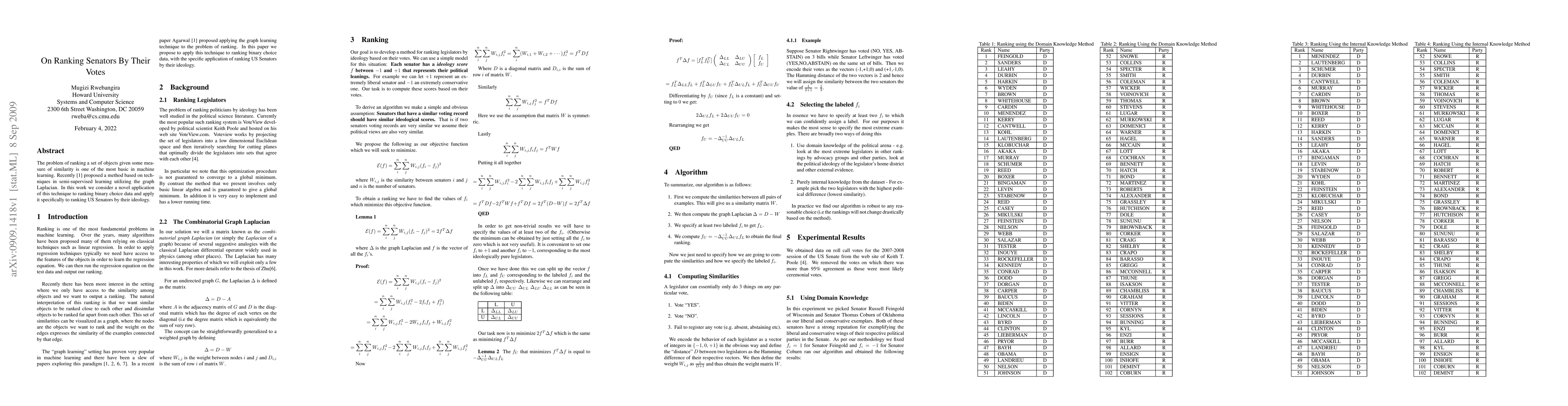 A novel application of semi-supervised learning techniques is used to rank US Senators by their ideology based on binary choice data. This method leverages the graph Laplacian to improve ranking accuracy.