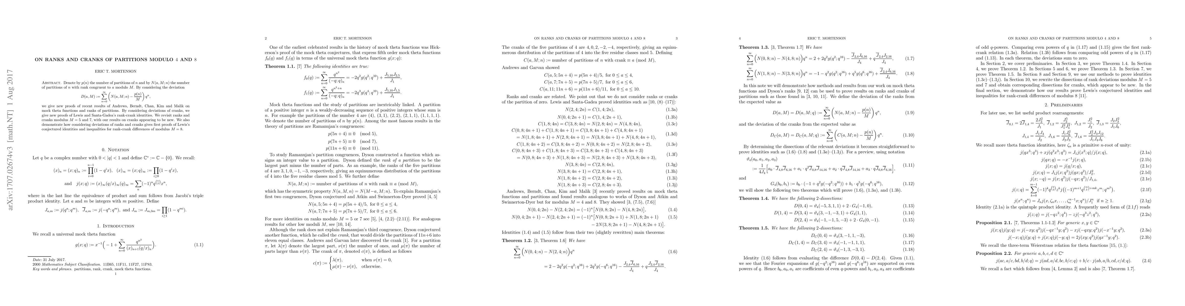 This paper provides new proofs for results on the ranks and cranks of partitions, particularly focusing on partitions modulo 4 and 8. It introduces the concept of deviations for ranks and cranks, leading to new proofs of recent conjectures and identities in the field.