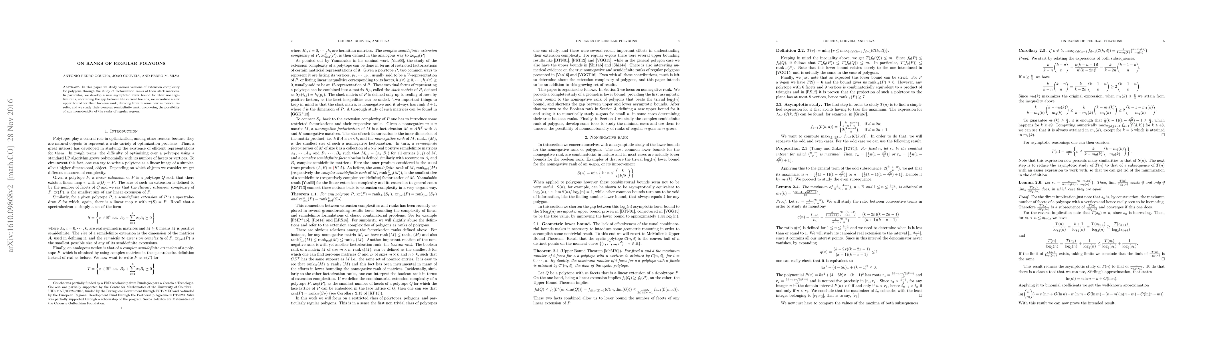 This paper investigates extension complexity for polygons by analyzing factorization ranks of their slack matrices, presenting new asymptotic lower bounds for nonnegative rank, a new upper bound for boolean rank, and exploring complex semidefinite rank, revealing potential non-monotonicity in the ranks of regular polygons.