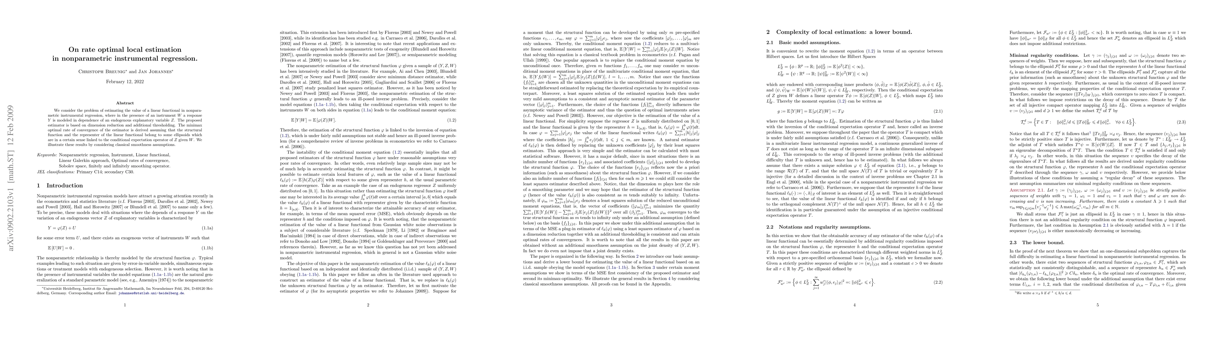 This paper proposes an optimal estimator for local estimation in nonparametric instrumental regression, employing dimension reduction and thresholding techniques. The minimax optimal convergence rate is derived under assumptions linking structural functions and linear functionals to ellipsoids tied to the conditional expectation operator.
