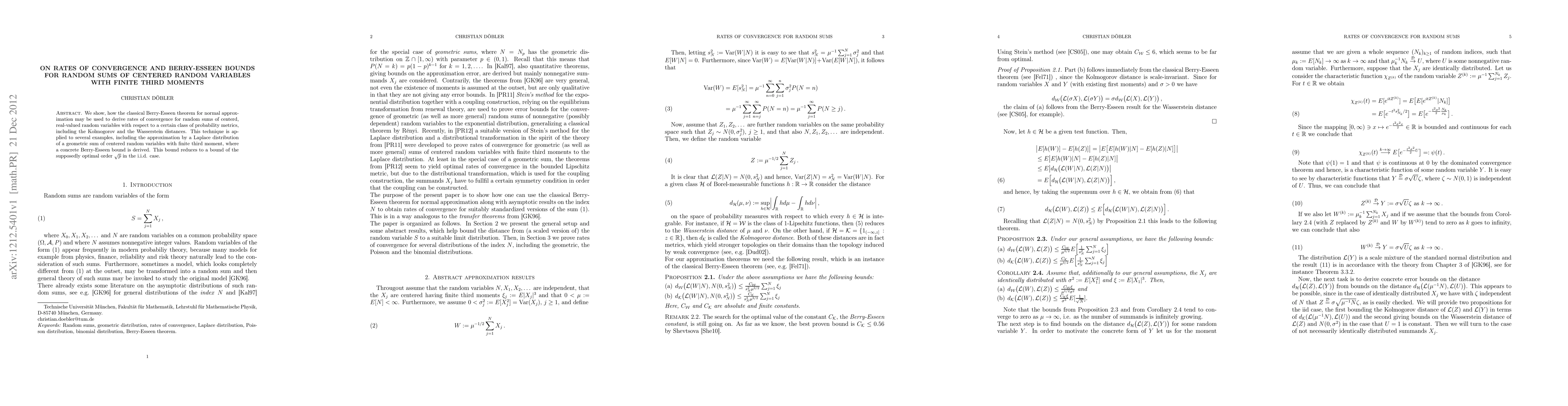 Summary: The paper establishes convergence rates and Berry-Esseen bounds for normal approximation in random sums of centered random variables, applying the classical theorem to derive results under various probability metrics. A specific example involving a geometric sum approximated by a Laplace distribution is analyzed, yielding an optimal order $\sqrt{p}$ bound in the independent and identically distributed case.