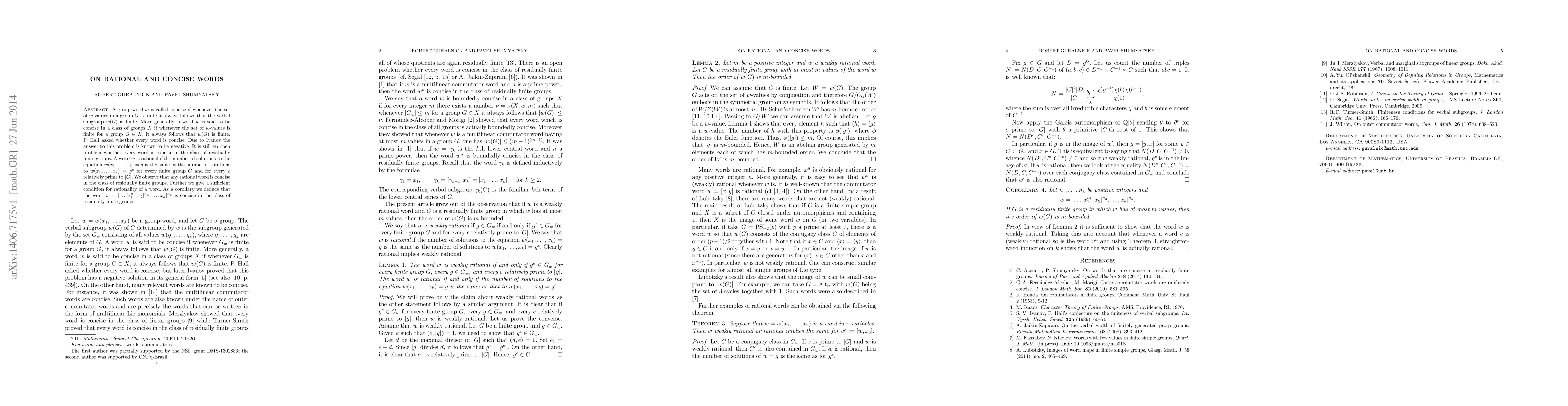 This research paper explores the concept of concise words in group theory, showing that rational words are concise in residually finite groups, and provides a sufficient condition for rationality.