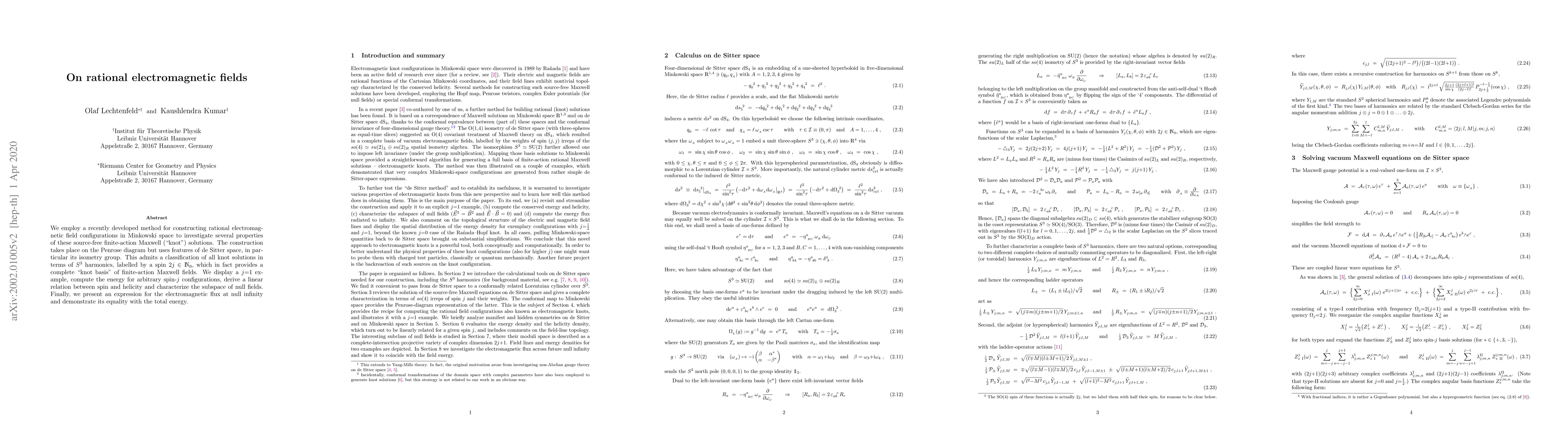 We employ a recently developed method for constructing rational electromagnetic field configurations in Minkowski space to investigate several properties of these source-free finite-action Maxwell ("knot") solutions. The construction takes place on the Penrose diagram but uses features of de Sitter space, in particular its isometry group. This admits a classification of all knot solutions in terms of $S^3$ harmonics, labelled by a spin $2j\in{\mathbb N}_0$, which in fact provides a complete "knot basis" of finite-action Maxwell fields. We display a $j{=}1$ example, compute the energy for arbitrary spin-$j$ configurations, derive a linear relation between spin and helicity and characterize the subspace of null fields. Finally, we present an expression for the electromagnetic flux at null infinity and demonstrate its equality with the total energy.