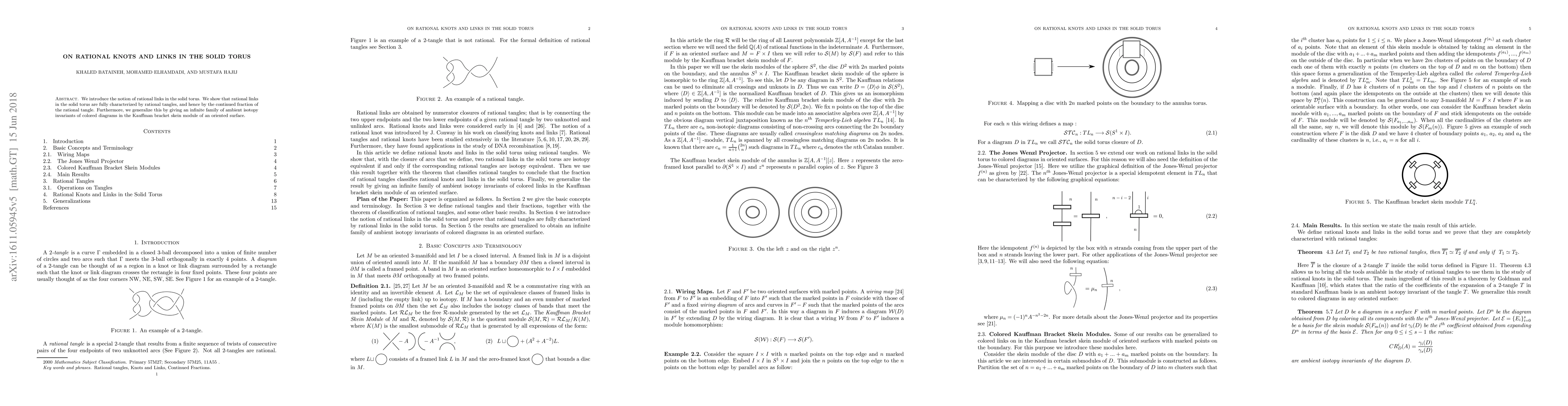 Summary: The paper defines rational links in the solid torus and shows they are characterized by rational tangles, represented by continued fractions. It also extends this concept to provide an infinite set of ambient isotopy invariants for colored diagrams in the Kauffman bracket skein module.