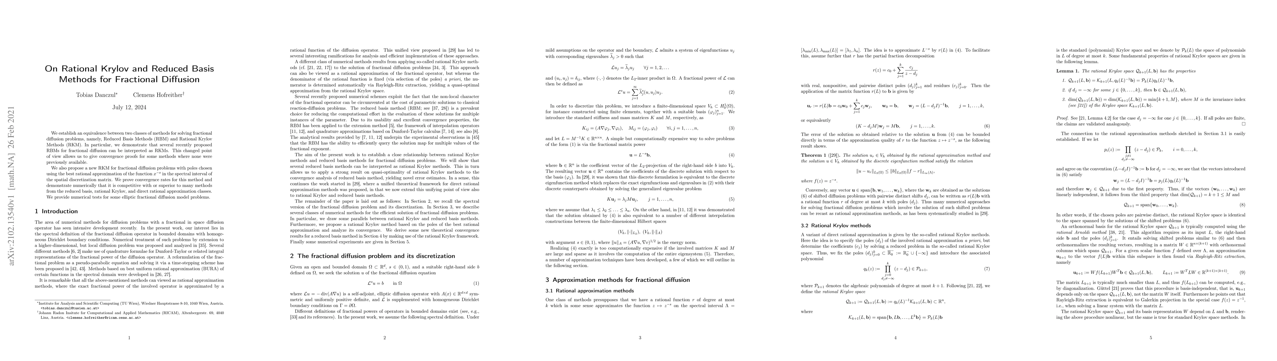 This paper establishes an equivalence between Reduced Basis Methods (RBM) and Rational Krylov Methods (RKM) for solving fractional diffusion problems, showing that certain RBMs can be viewed as RKMs. It introduces a new RKM with optimized pole selection and demonstrates its competitive convergence rates and performance through numerical tests on elliptic fractional diffusion models.