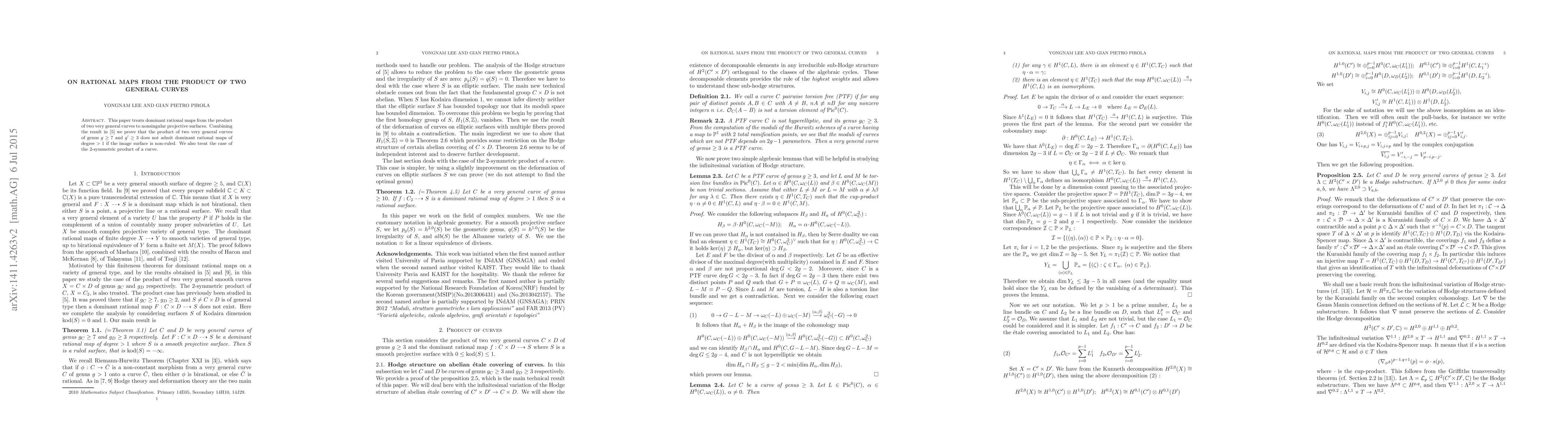 This paper proves that the product of two general curves, where one has genus $g\geq 7$ and the other $g'\geq 3$, does not allow dominant rational maps of degree greater than 1 to non-ruled surfaces. It also examines the 2-symmetric product of a curve.