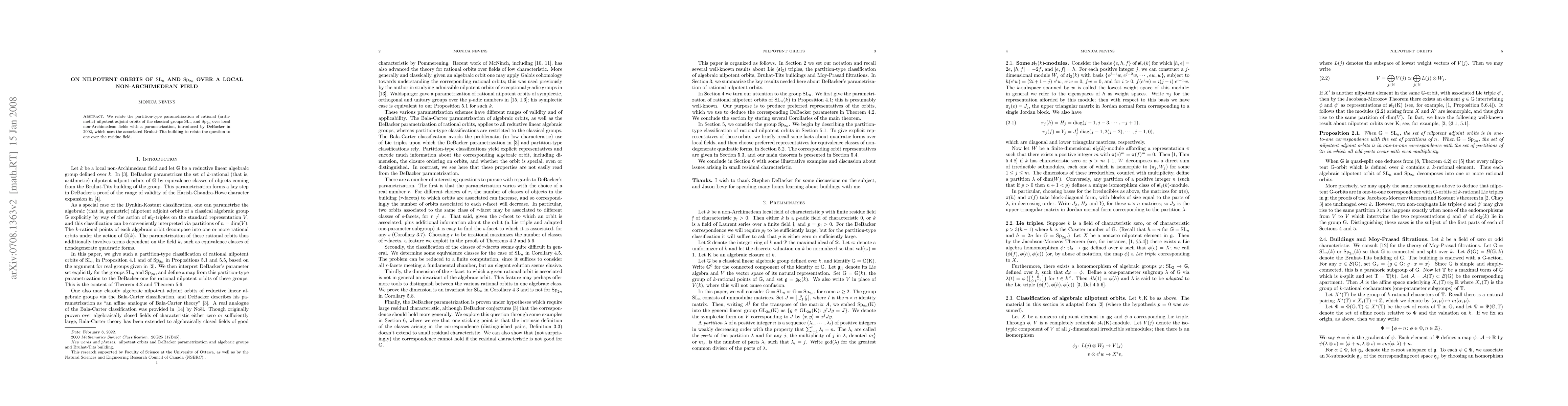This paper connects the partition-type parametrization of rational nilpotent adjoint orbits in $SL_n$ and $Sp_{2n}$ over local non-Archimedean fields to DeBacker's 2002 method using the Bruhat-Tits building, thereby linking the problem to one over the residue field.