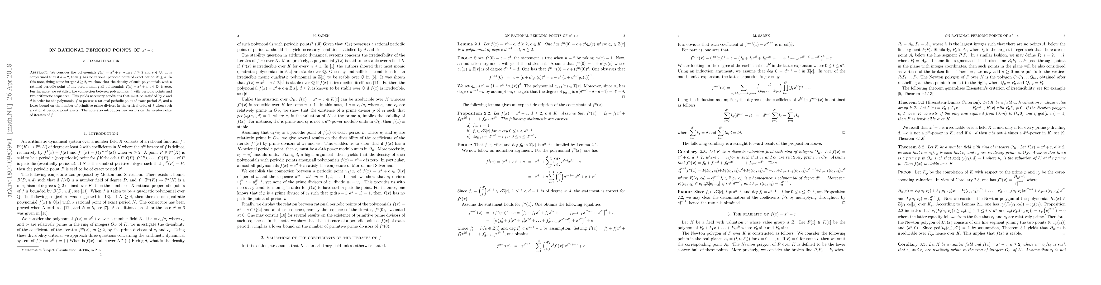 Researchers show that polynomials of the form $x^d + c$ have no rational periodic points of exact period $N ge 4$, except for specific conditions involving arithmetic sequences.
