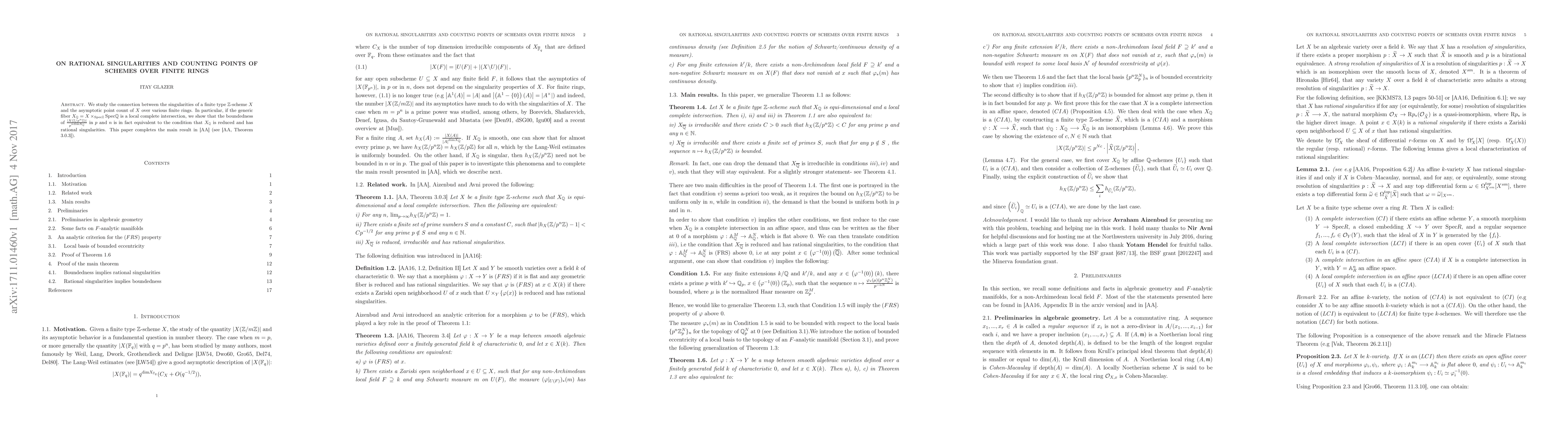 This paper studies the connection between singularities of finite type schemes over finite rings and asymptotic point counts, finding a key equivalence for local complete intersection fibers with rational singularities.