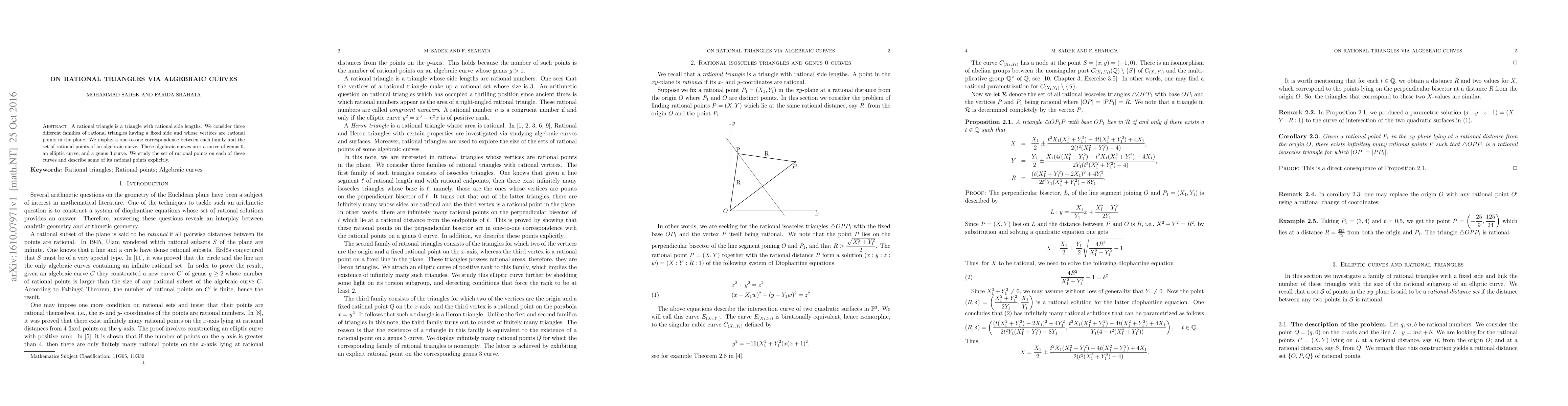 This paper explores rational triangles with rational side lengths and establishes a one-to-one correspondence between three families of such triangles and the rational points on algebraic curves: a genus 0 curve, an elliptic curve, and a genus 3 curve. It explicitly describes some rational points on these curves.