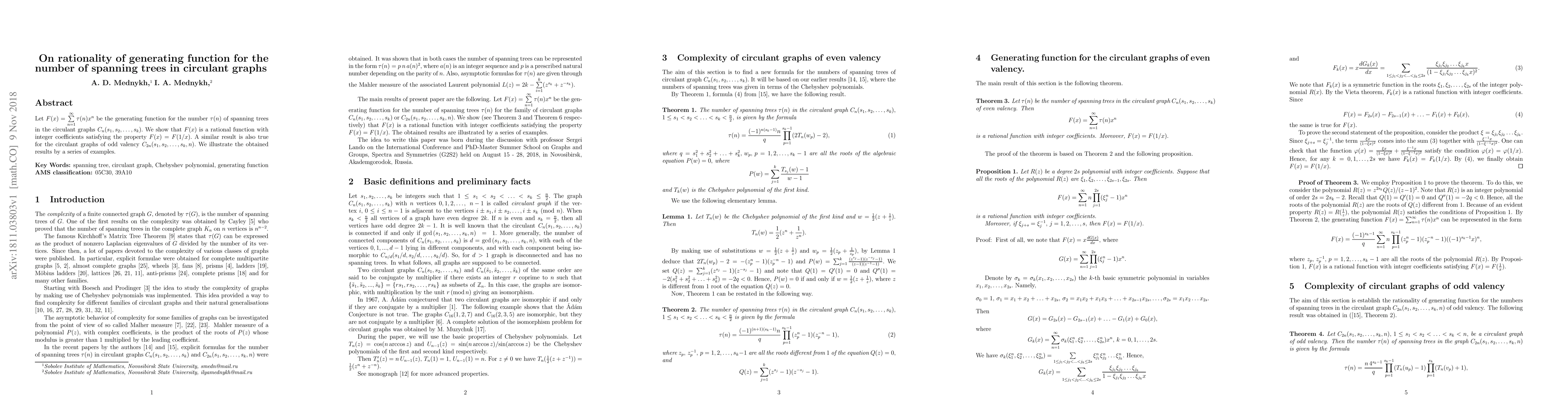 This paper proves that the generating function $F(x)$ for the number of spanning trees in circulant graphs $C_{n}(s_1,s_2,\ldots,s_k)$ is a rational function with integer coefficients that satisfies $F(x) = F(1/x)$. The same rationality property holds for circulant graphs of odd valency $C_{2n}(s_1,s_2,\ldots,s_k,n)$.
