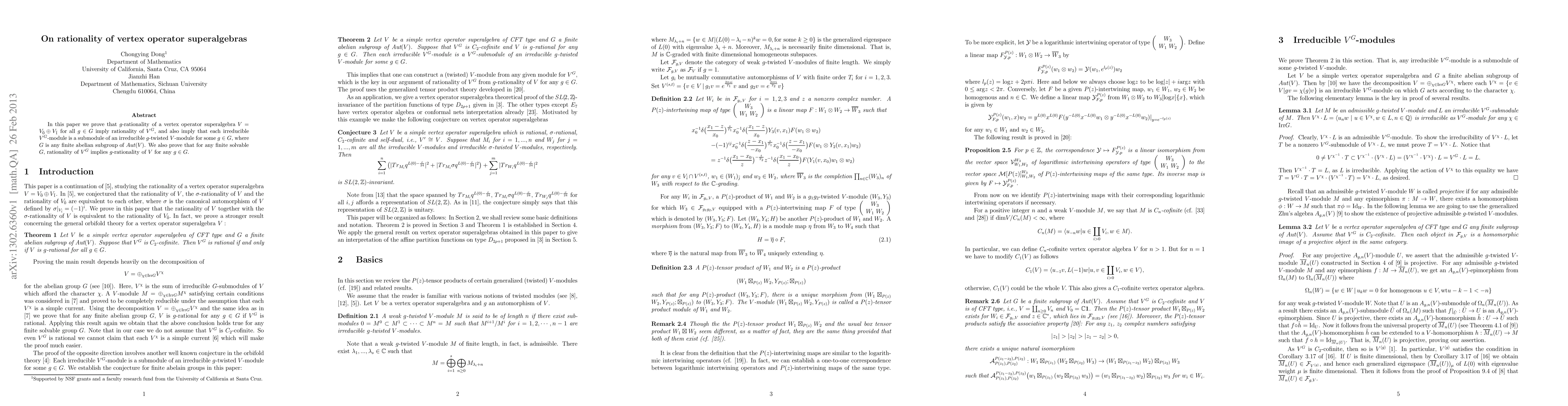 Summary: The paper proves that g-rationality of a vertex operator superalgebra V for all g in a finite abelian group G implies rationality of V^G and that each irreducible V^G-module is a submodule of an irreducible g-twisted V-module. Additionally, it shows that for any finite solvable group G, rationality of V^G implies g-rationality of V for any g in G.