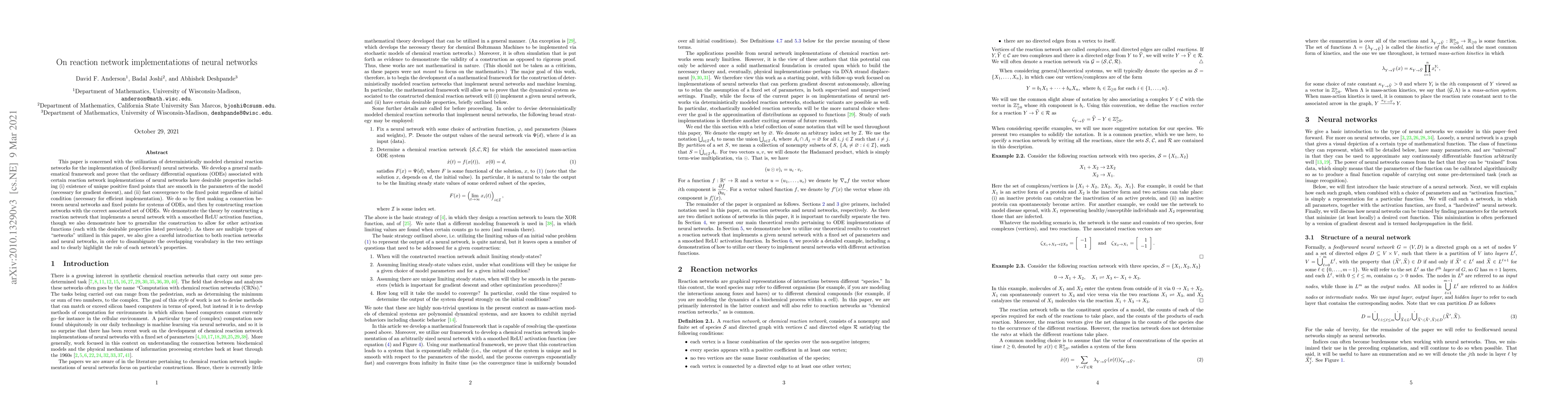 This paper is concerned with the utilization of deterministically modeled chemical reaction networks for the implementation of (feed-forward) neural networks. We develop a general mathematical framework and prove that the ordinary differential equations (ODEs) associated with certain reaction network implementations of neural networks have desirable properties including (i) existence of unique positive fixed points that are smooth in the parameters of the model (necessary for gradient descent), and (ii) fast convergence to the fixed point regardless of initial condition (necessary for efficient implementation). We do so by first making a connection between neural networks and fixed points for systems of ODEs, and then by constructing reaction networks with the correct associated set of ODEs. We demonstrate the theory by constructing a reaction network that implements a neural network with a smoothed ReLU activation function, though we also demonstrate how to generalize the construction to allow for other activation functions (each with the desirable properties listed previously). As there are multiple types of "networks" utilized in this paper, we also give a careful introduction to both reaction networks and neural networks, in order to disambiguate the overlapping vocabulary in the two settings and to clearly highlight the role of each network's properties.
