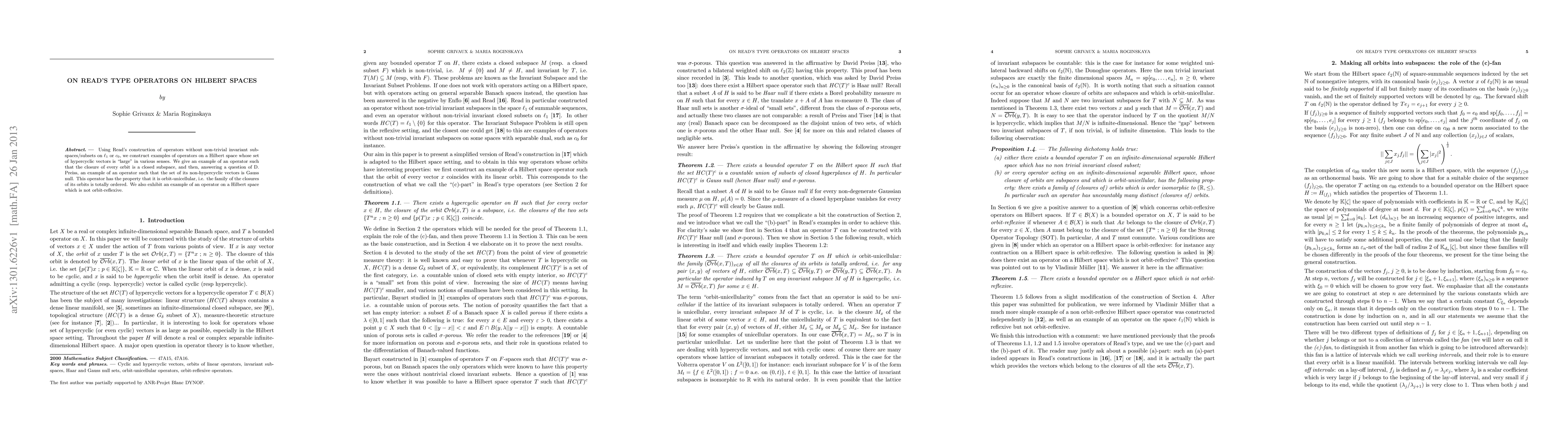 Using Read's construction of operators without non-trivial invariant subspaces/subsets on $\ell_{1}$ or $c_{0}$, we construct examples of operators on a Hilbert space whose set of hypercyclic vectors is "large" in various senses. We give an example of an operator such that the closure of every orbit is a closed subspace, and then, answering a question of D. Preiss, an example of an operator such that the set of its non-hypercyclic vectors is Gauss null. This operator has the property that it is orbit-unicellular, i.e. the family of the closures of its orbits is totally ordered. We also exhibit an example of an operator on a Hilbert space which is not orbit-reflexive.