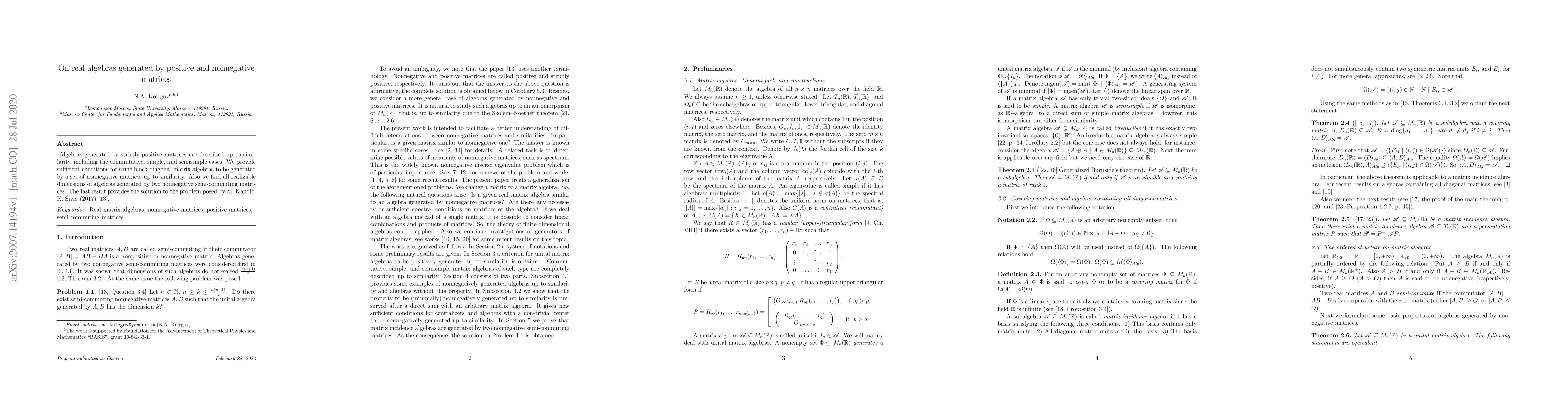 This paper characterizes algebras generated by strictly positive matrices, detailing conditions for block diagonal matrix algebras generated by nonnegative matrices. It also determines the realizable dimensions for algebras from two nonnegative semi-commuting matrices, solving a problem posed by Kandić and Šić in 2017.