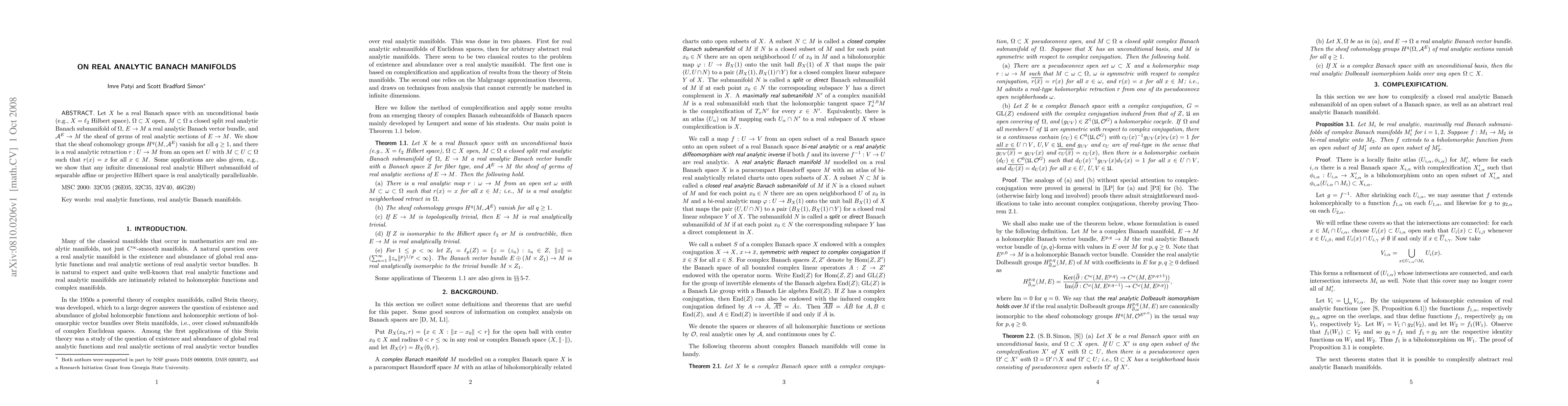 Let $X$ be a real Banach space with an unconditional basis (e.g., $X=\ell_2$ Hilbert space), $\Omega\subset X$ open, $M\subset\Omega$ a closed split real analytic Banach submanifold of $\Omega$, $E\to M$ a real analytic Banach vector bundle, and ${\Cal A}^E\to M$ the sheaf of germs of real analytic sections of $E\to M$. We show that the sheaf cohomology groups $H^q(M,{\Cal A}^E)$ vanish for all $q\ge1$, and there is a real analytic retraction $r:U\to M$ from an open set $U$ with $M\subset U\subset\Omega$ such that $r(x)=x$ for all $x\in M$. Some applications are also given, e.g., we show that any infinite dimensional real analytic Hilbert submanifold of separable affine or projective Hilbert space is real analytically parallelizable.