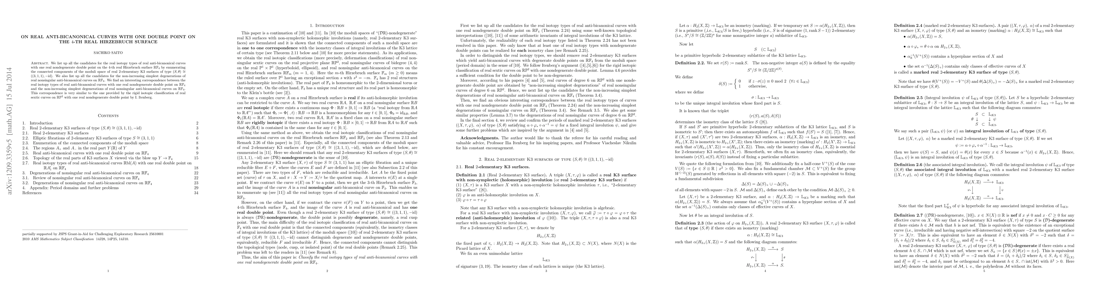 We list up all the candidates for the real isotopy types of real anti-bicanonical curves with one real nondegenerate double point on the 4-th real Hirzebruch surface RF_4 by enumerating the connected components of the moduli space of real 2-elementary K3 surfaces of type (S,\theta)=((3,1,1), -id). We also list up all the candidates for the non-increasing simplest degenerations of real nonsingular anti-bicanonical curves on RF_4. We find an interesting correspondence between the real isotopy types of real anti-bicanonical curves with one real nondegenerate double point on RF_4 and the non-increasing simplest degenerations of real nonsingular anti-bicanonical curves on RF_4. This correspondence is very similar to the one provided by the rigid isotopic classification of real sextic curves on RP^2 with one real nondegenerate double point by I. Itenberg.