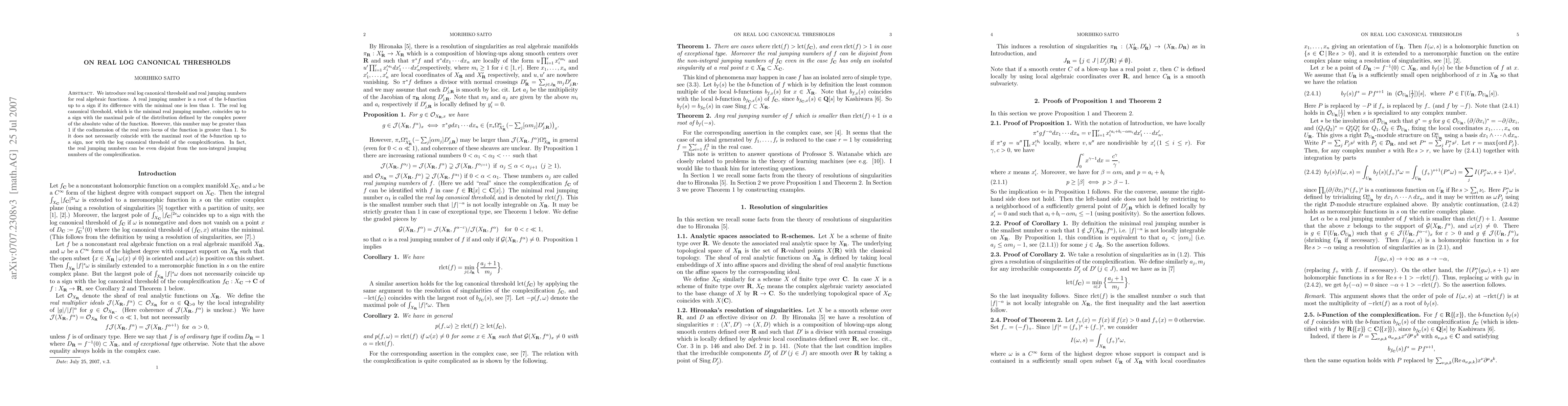 This paper introduces the concept of real log canonical thresholds and real jumping numbers for real algebraic functions, revealing they may differ from their complex counterparts, especially when the codimension of the real zero locus exceeds 1. The real log canonical threshold can be greater than 1 and may not align with the maximal root of the b-function or the log canonical threshold of the complexification.