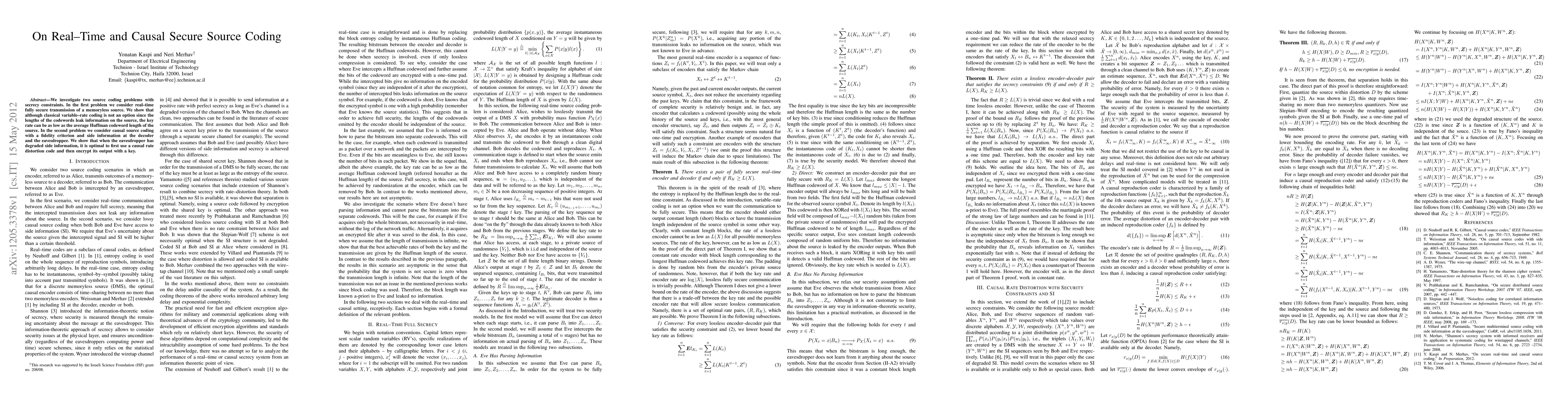 This paper explores secure source coding under secrecy constraints, demonstrating that real-time secure transmission of a memoryless source can achieve a key rate comparable to the average Huffman codeword length. It also reveals that for causal source coding with a fidelity criterion, optimal strategy involves using a causal rate distortion code followed by encryption when the eavesdropper has degraded side information.
