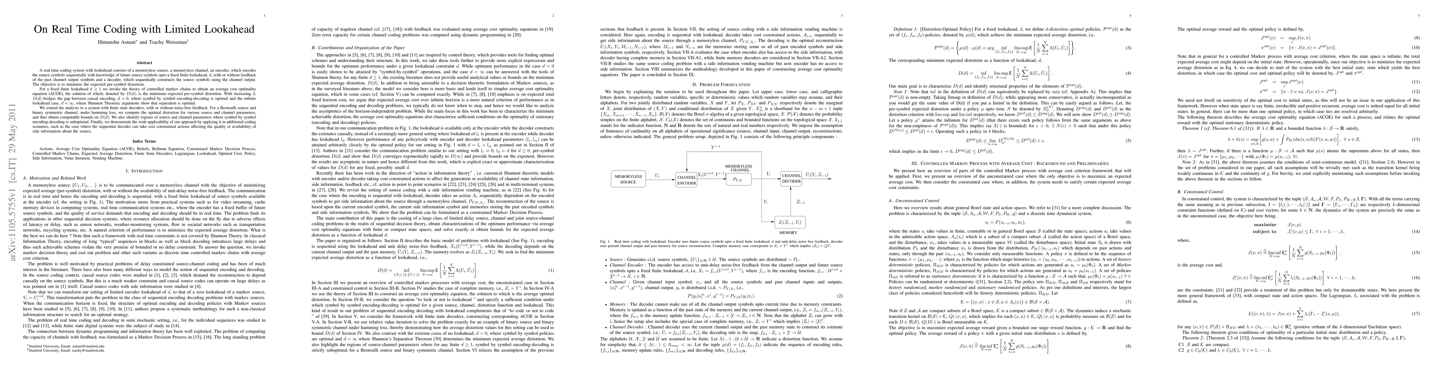 A real time coding system with lookahead consists of a memoryless source, a memoryless channel, an encoder, which encodes the source symbols sequentially with knowledge of future source symbols upto a fixed finite lookahead, d, with or without feedback of the past channel output symbols and a decoder, which sequentially constructs the source symbols using the channel output. The objective is to minimize the expected per-symbol distortion. For a fixed finite lookahead d>=1 we invoke the theory of controlled markov chains to obtain an average cost optimality equation (ACOE), the solution of which, denoted by D(d), is the minimum expected per-symbol distortion. With increasing d, D(d) bridges the gap between causal encoding, d=0, where symbol by symbol encoding-decoding is optimal and the infinite lookahead case, d=\infty, where Shannon Theoretic arguments show that separation is optimal. We extend the analysis to a system with finite state decoders, with or without noise-free feedback. For a Bernoulli source and binary symmetric channel, under hamming loss, we compute the optimal distortion for various source and channel parameters, and thus obtain computable bounds on D(d). We also identify regions of source and channel parameters where symbol by symbol encoding-decoding is suboptimal. Finally, we demonstrate the wide applicability of our approach by applying it in additional coding scenarios, such as the case where the sequential decoder can take cost constrained actions affecting the quality or availability of side information about the source.